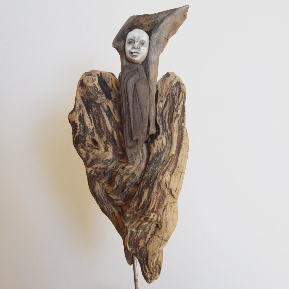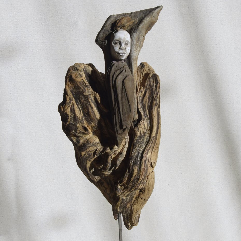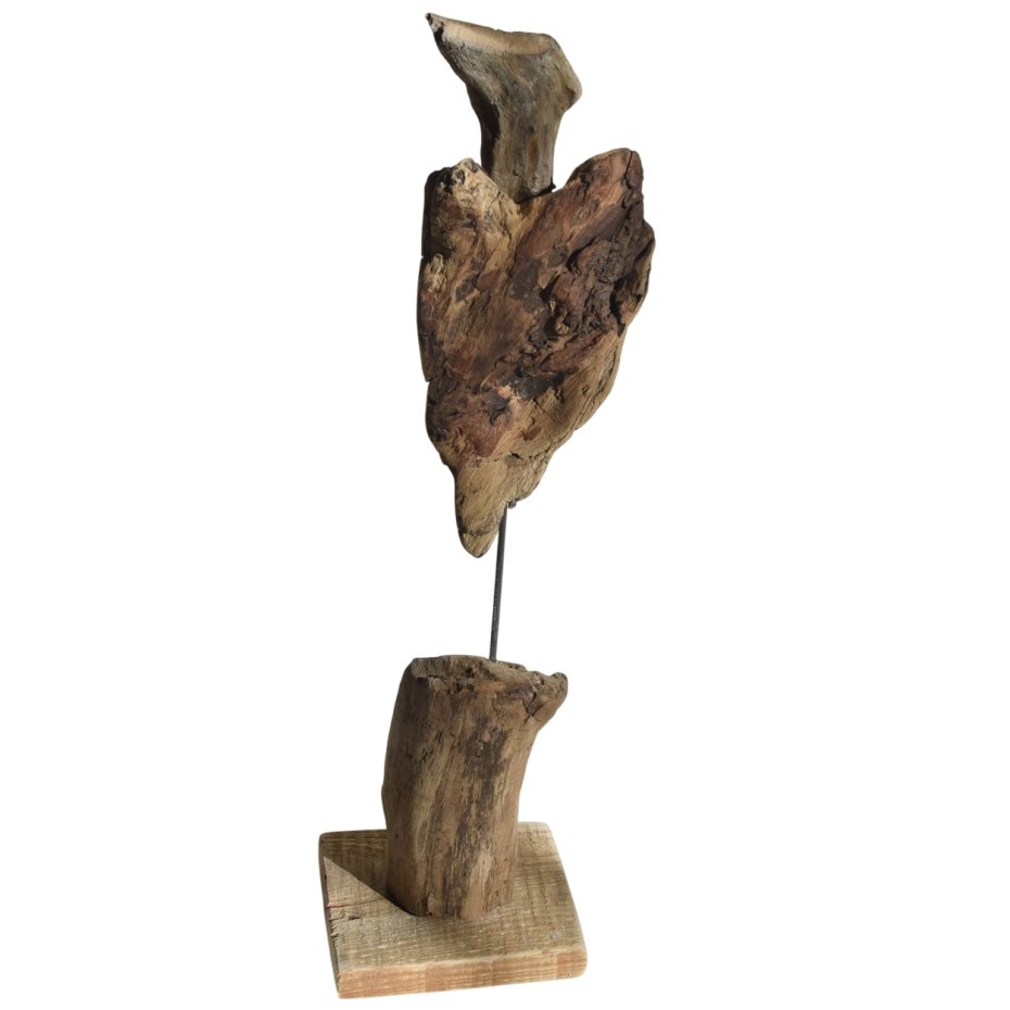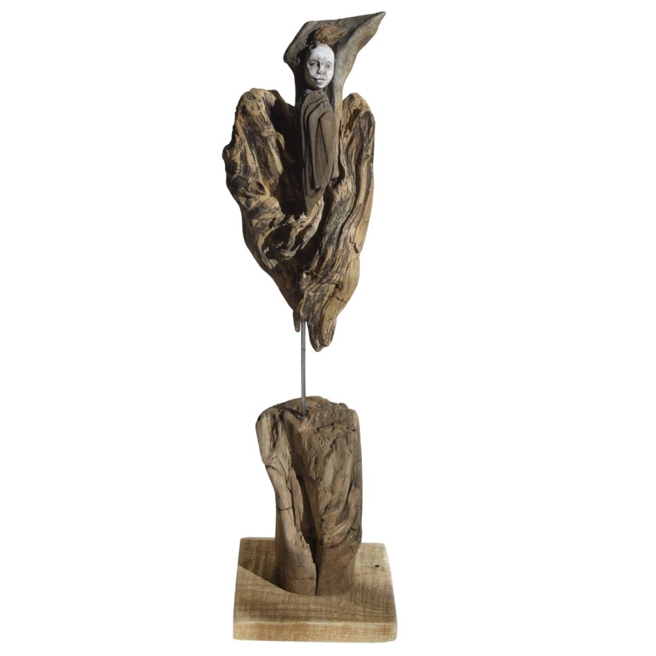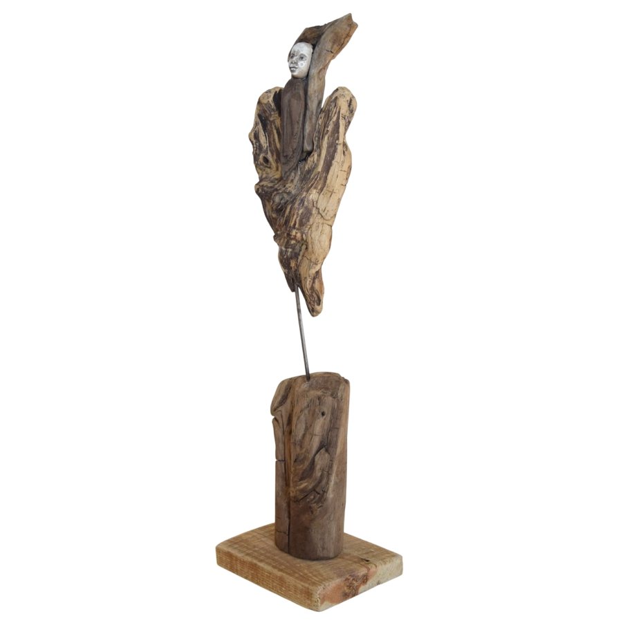 Rzeźba/ figurka - abstrakcyjna postać, dekoracja wykonana ze znalezionego na bałtyckiej plaży starego drewna, oraz gipsu, z podstawą z drewna ze starej deski. Niepowtarzalny kształt wyrzeźbionego przez wodę i czas drewna sprawia, że rzeźba jest unikatowa - jedyny, niepowtarzalny egzemplarz. Wykorzystaniem starego drewna z jego niedoskonałościami dekoracja nawiązuje do stylu wabi-sabi.
