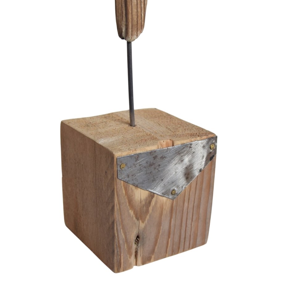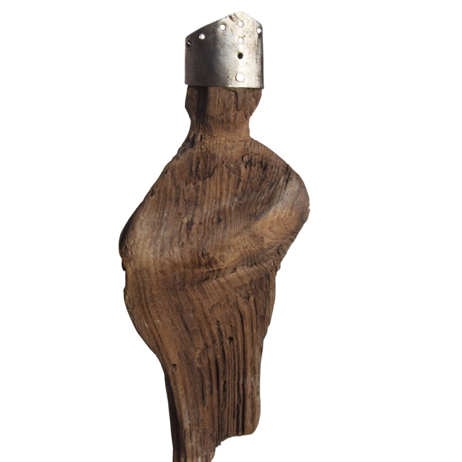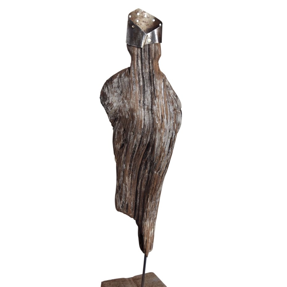 Rzeźba/ figurka - abstrakcyjna postać, dekoracja wykonana ze znalezionego na bałtyckiej plaży starego drewna oraz starej blachy z podstawą z drewna ze starych palet. Niepowtarzalny kształt wyrzeźbionego przez wodę i czas drewna sprawia, że rzeźba jest unikatowa - jedyny, niepowtarzalny egzemplarz. Wykorzystaniem starego drewna z jego niedoskonałościami, starej blachy z naleciałościami rdzy, dekoracja nawiązuje do stylu wabi-sabi.