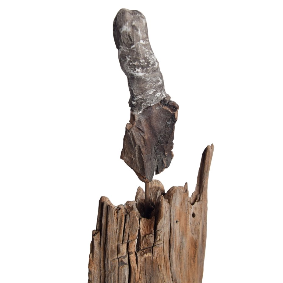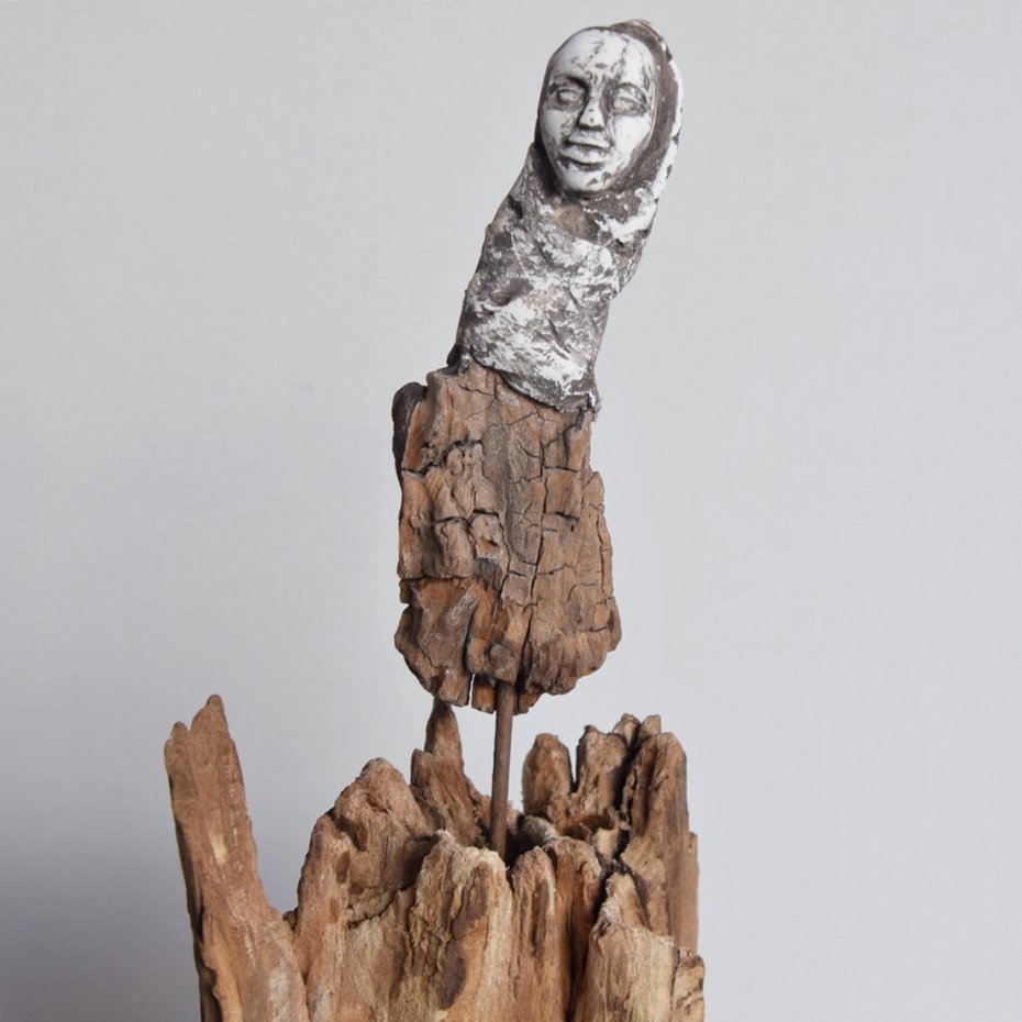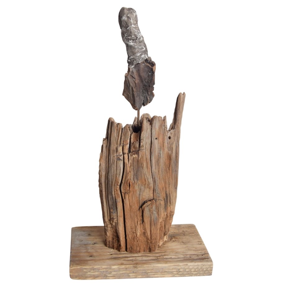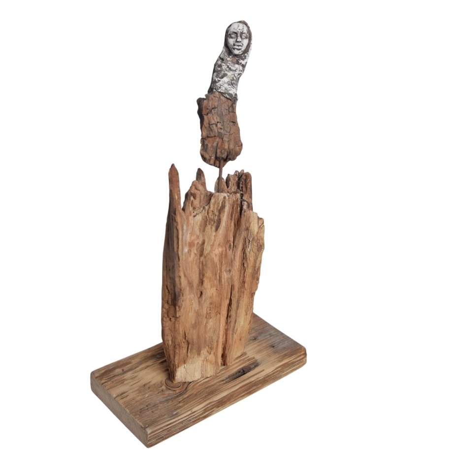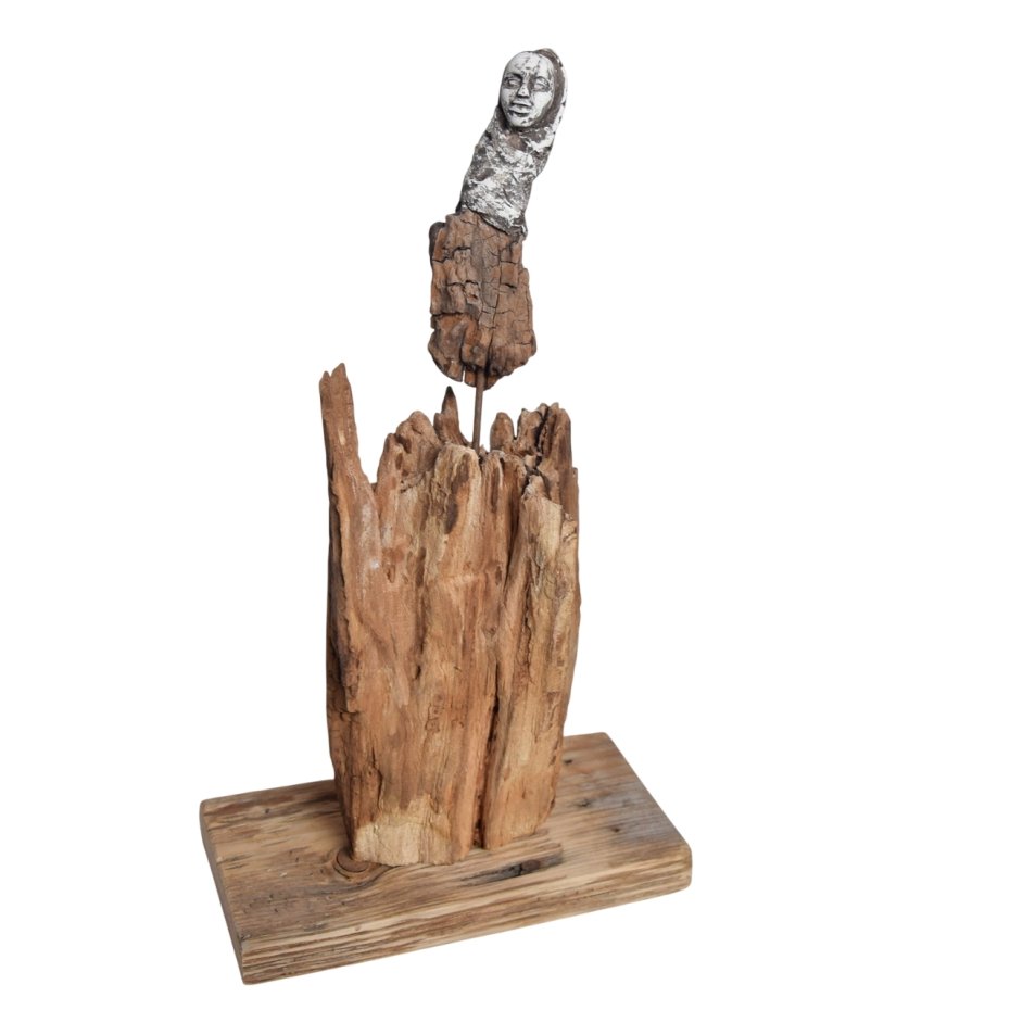 Rzeźba/ figurka - abstrakcyjna postać, dekoracja wykonana ze znalezionego na bałtyckiej plaży starego drewna, oraz gipsu, z podstawą ze starej deski. Niepowtarzalny kształt wyrzeźbionego przez wodę i czas drewna sprawia, że rzeźba jest unikatowa - jedyny, niepowtarzalny egzemplarz. Wykorzystaniem starego drewna z jego niedoskonałościami dekoracja nawiązuje do stylu wabi-sabi.
