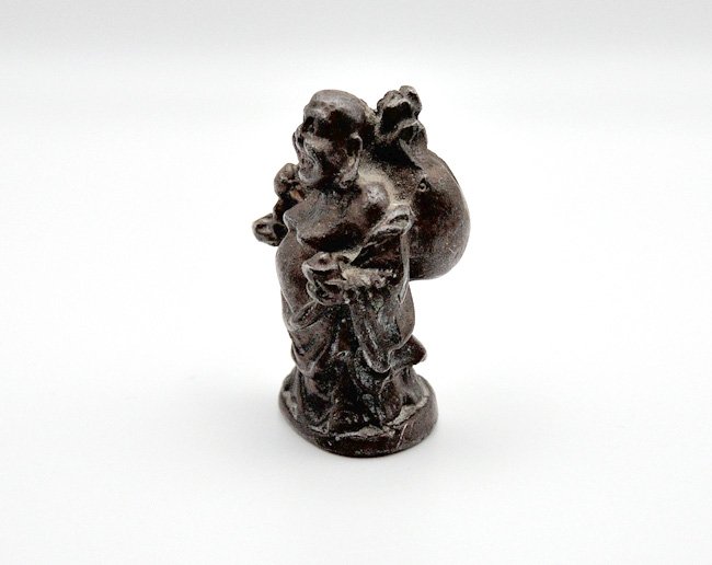 Uroczy, niewielki, śmiejący się Budda odlany z ciężkiego metalu. Budda jest wędrujący, z workiem na plecach, trzyma tez coś w rękach i szeroko się uśmiecha.