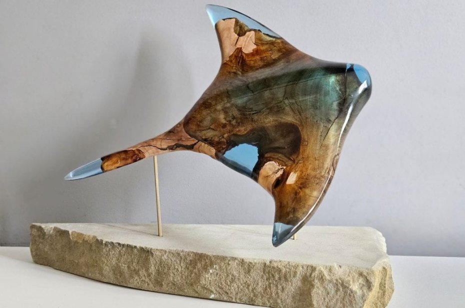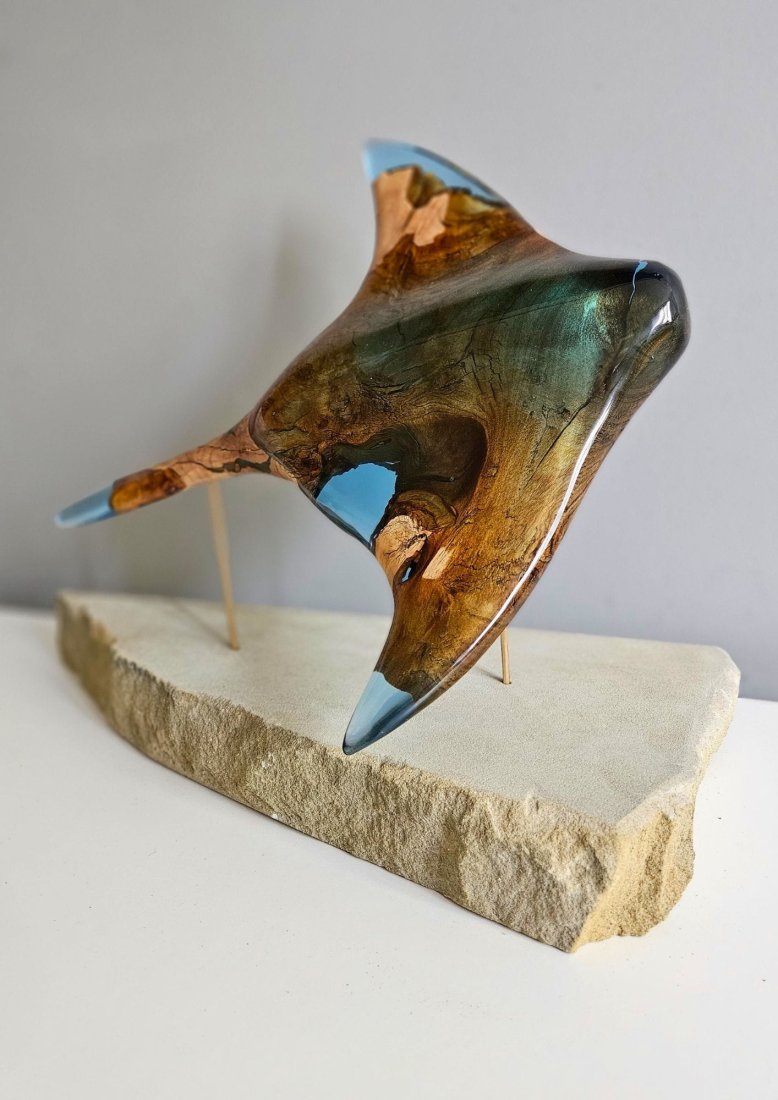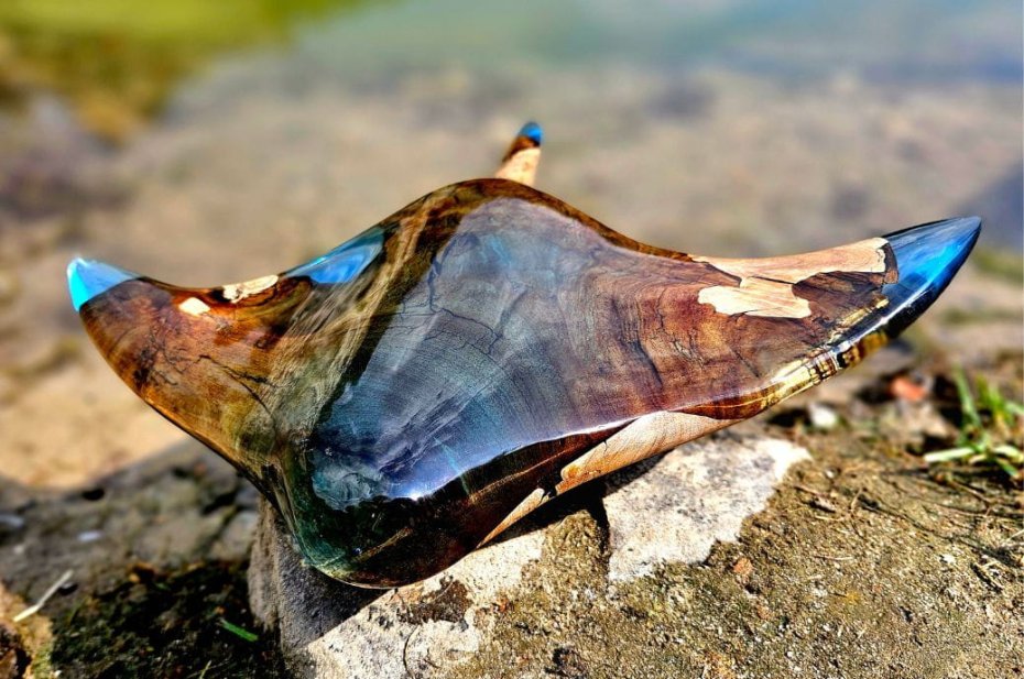 Płaszczka stworzona z drewna oliwkowego i żywicy epoksydowej, to efekt wielodniowej, precyzyjnej i wieloetapowej pracy ręcznej z projektu, który zrodził się w naszych głowach.