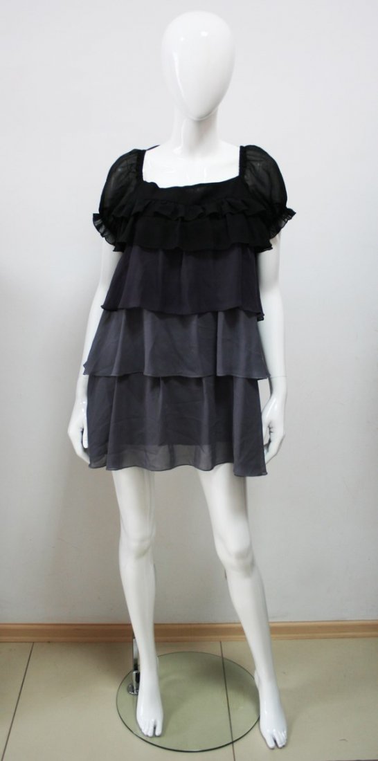 Fantastyczna tunika, sukienka w warstwowo naszyte falbanki w kolorach szarości. Duży dekolt z tyłu wiązany.