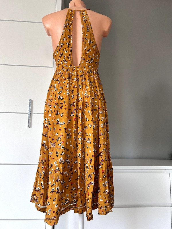 Sukienka firmy Cooperative, 100 % rayon, a więc przewiewna, idealna na lato. Kolor musztardowy, wzór drobna łączka. Dekolt v, ozdobna mereżka przy dekolcie, na plecach i na dole sukienki. Długość midi, dopasowana góra, szeroki dół, zwiewny kobiecy fason. Polecam ????