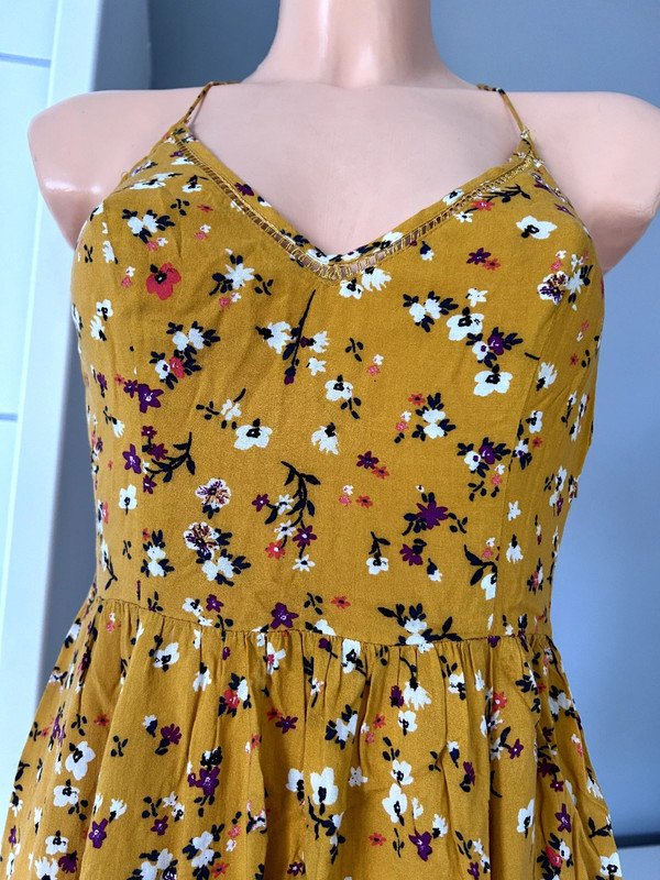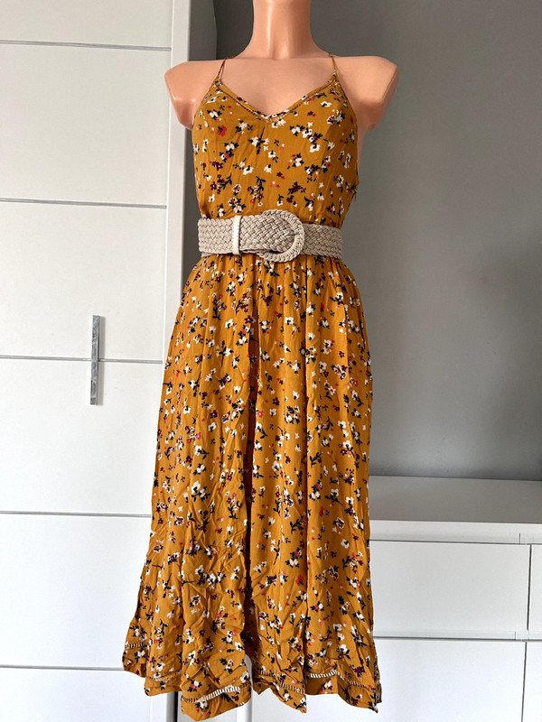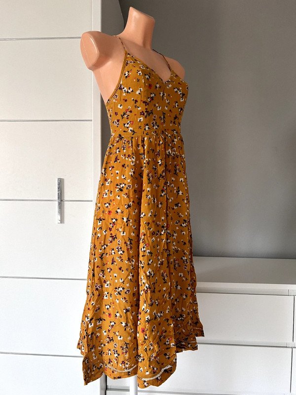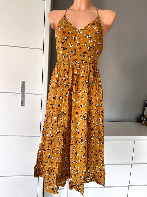 Sukienka firmy Cooperative, 100 % rayon, a więc przewiewna, idealna na lato. Kolor musztardowy, wzór drobna łączka. Dekolt v, ozdobna mereżka przy dekolcie, na plecach i na dole sukienki. Długość midi, dopasowana góra, szeroki dół, zwiewny kobiecy fason. Polecam ????