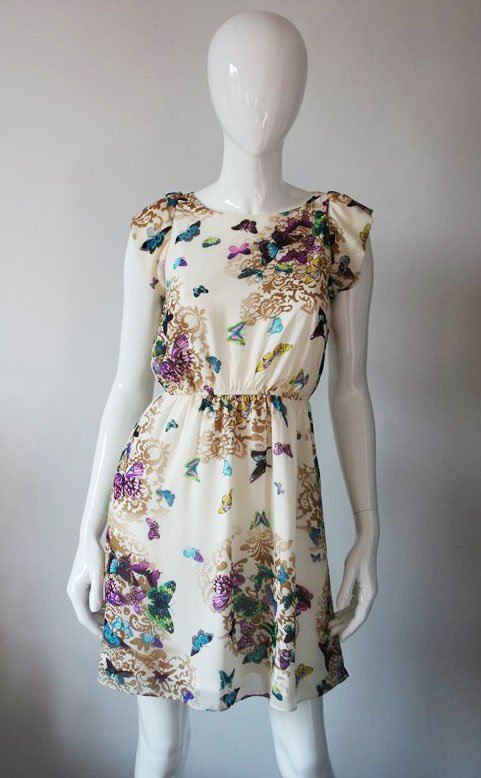Cudowna sukienka Eage. Sukienka kremowa w kolorowe motyle. Pas marszczony gumeczką. Podszewka.