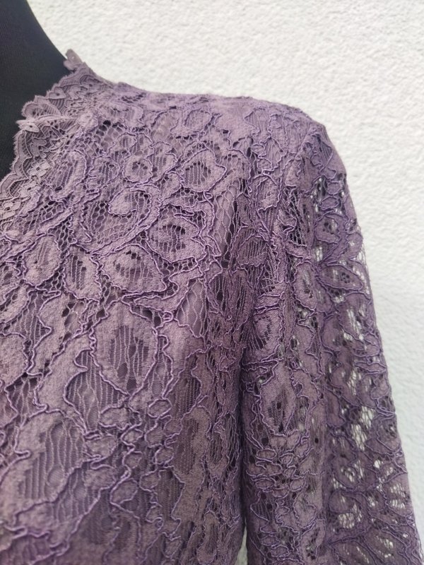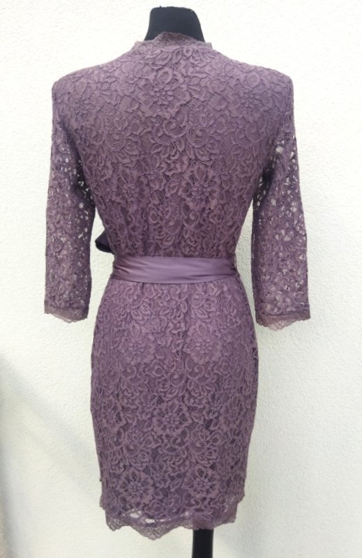 Wspaniała , elegancka koronkowa sukienka w kolorze zgaszonego fioletu z kroplą brązu. Kopertowy fason, wiązany szarfami z jednego boku, Dekolt w szpic, rękawy 3/4. na rozciągliwej podszewce w tym samym kolorze ( oprócz rękawów)