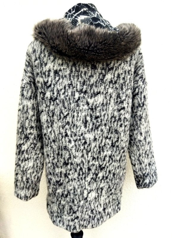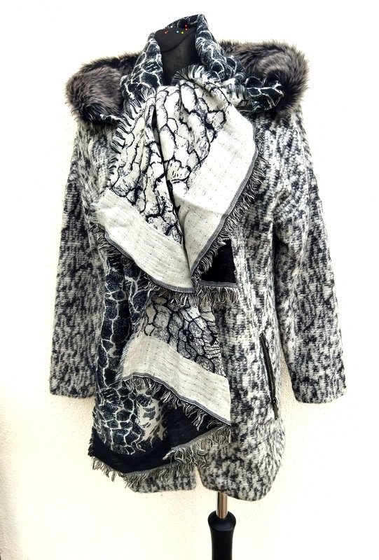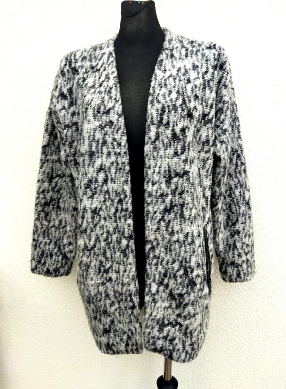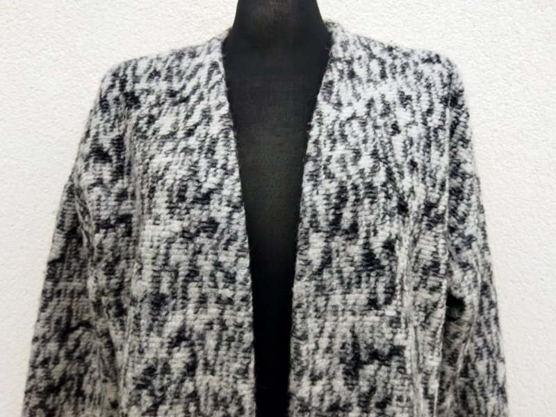 Nieocieplana kurtka z tkaniny z faktura boucle w szaro-grafitowej kolorystyce. Fason otwarty z dwiema wpuszczanymi kieszeniami z zamkami. na rozciągliwej podszewce.