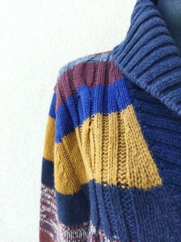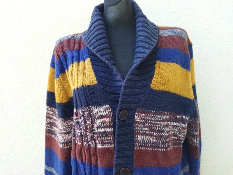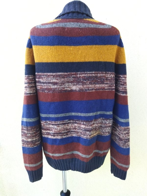 Męski bawełniano-wełniany sweter w pasy w zgaszonej kolorystyce granatu , kasztanowego brązu, złamanej bieli, szarości ceglastej żółci miejscowo w melanżowej kompozycji. Z szalowym kołnierzem , zapinany na guziki. Wykończony ściągaczami