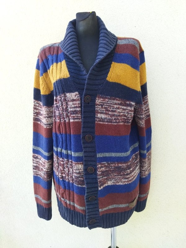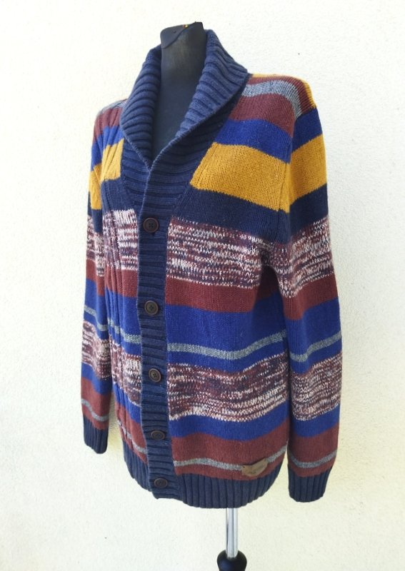 Męski bawełniano-wełniany sweter w pasy w zgaszonej kolorystyce granatu , kasztanowego brązu, złamanej bieli, szarości ceglastej żółci miejscowo w melanżowej kompozycji. Z szalowym kołnierzem , zapinany na guziki. Wykończony ściągaczami