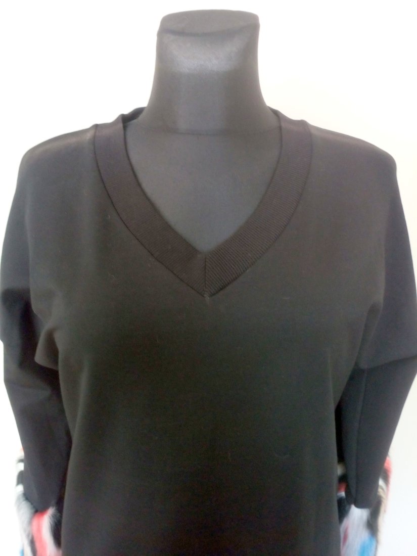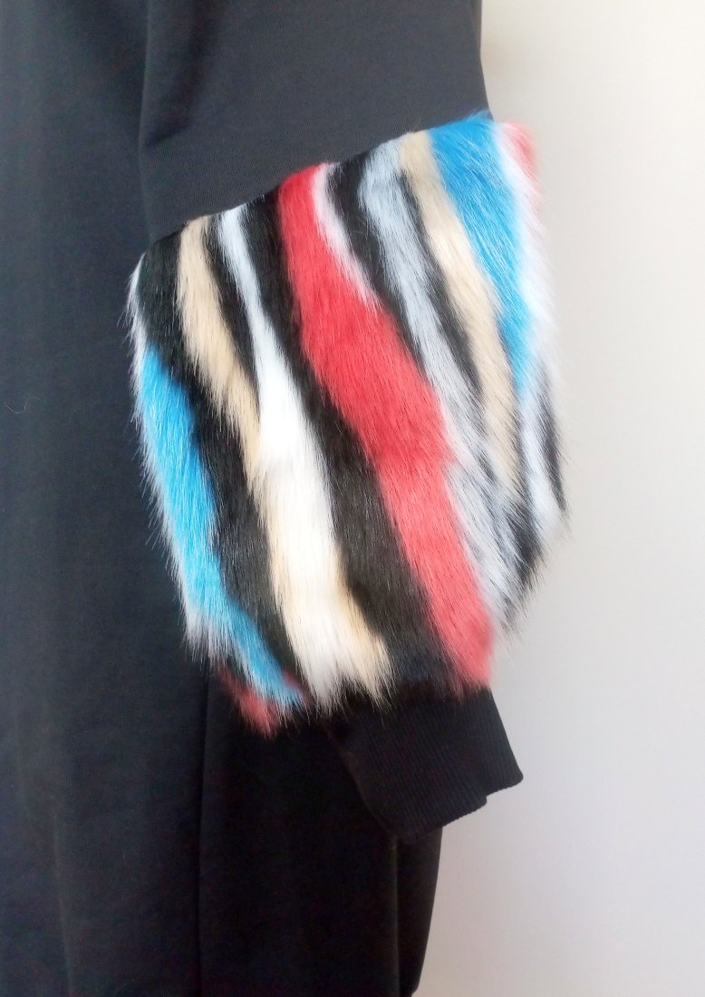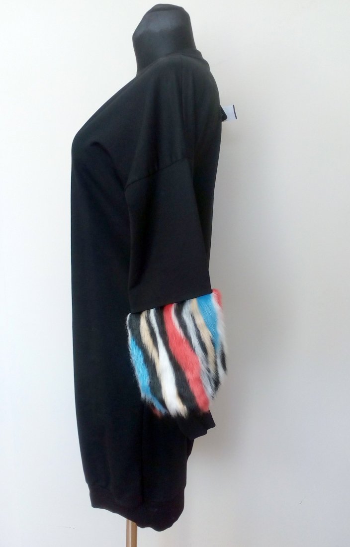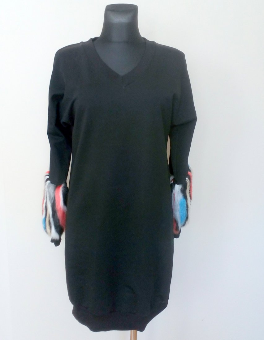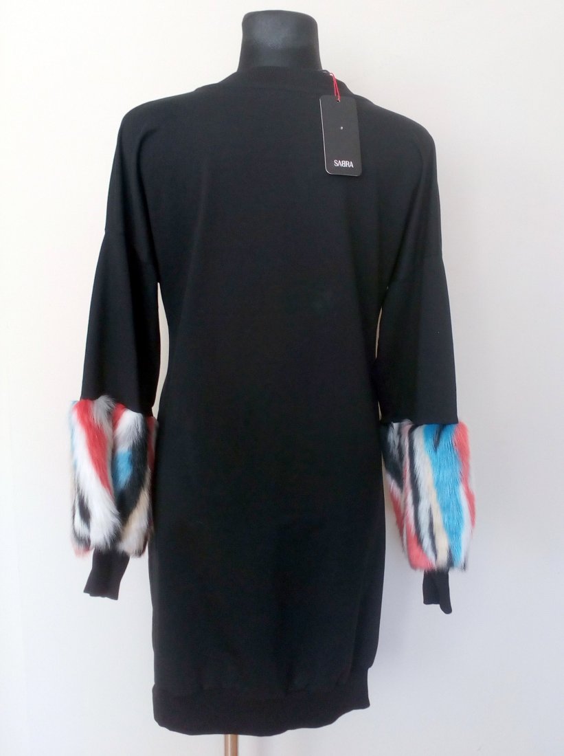 Nowa, czarna sukienka z elastycznej dzianiny dresowej, dekolt w szpic ze ściągaczową listwą, rękawy obniżane, zdobione futerkiem, ze ściągaczem u dołu. ściągacz również u dołu sukienki