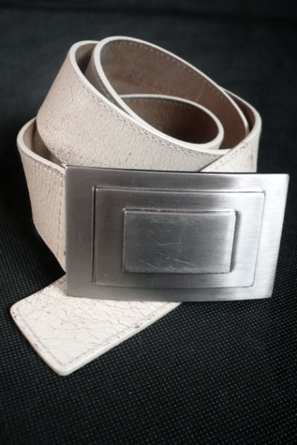 Solidny pasek uszyty z grubej skóry - malowanej na biało -celowo przetarty. Duża-metalowa klamra.Zapinany na bolec.