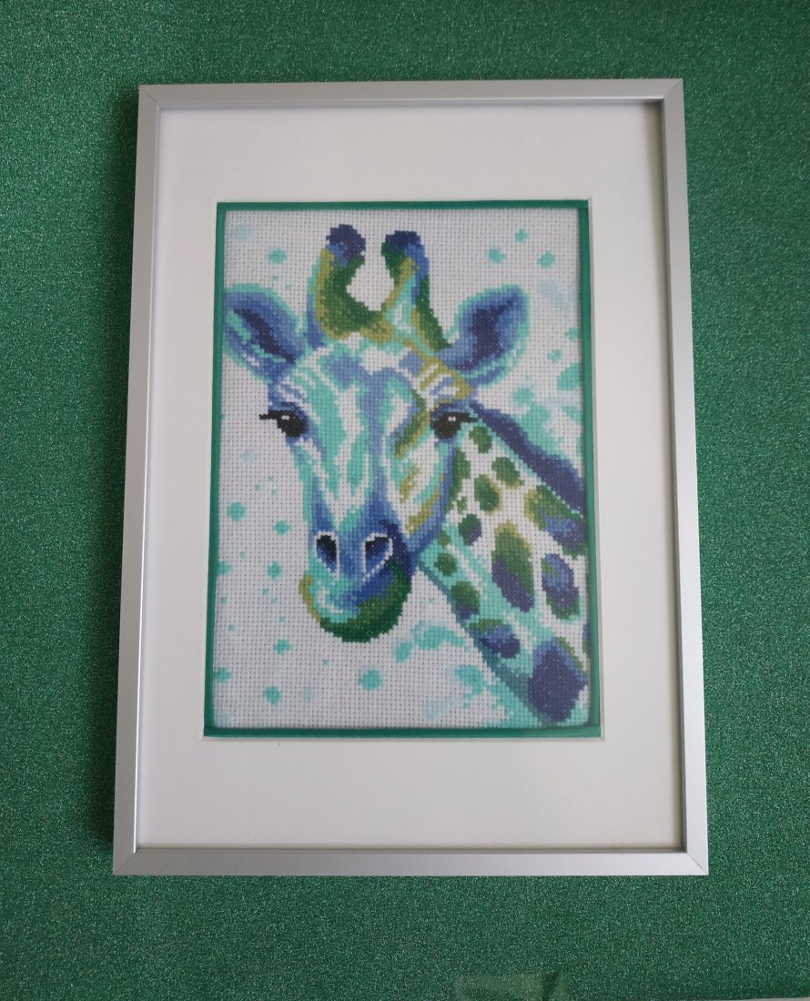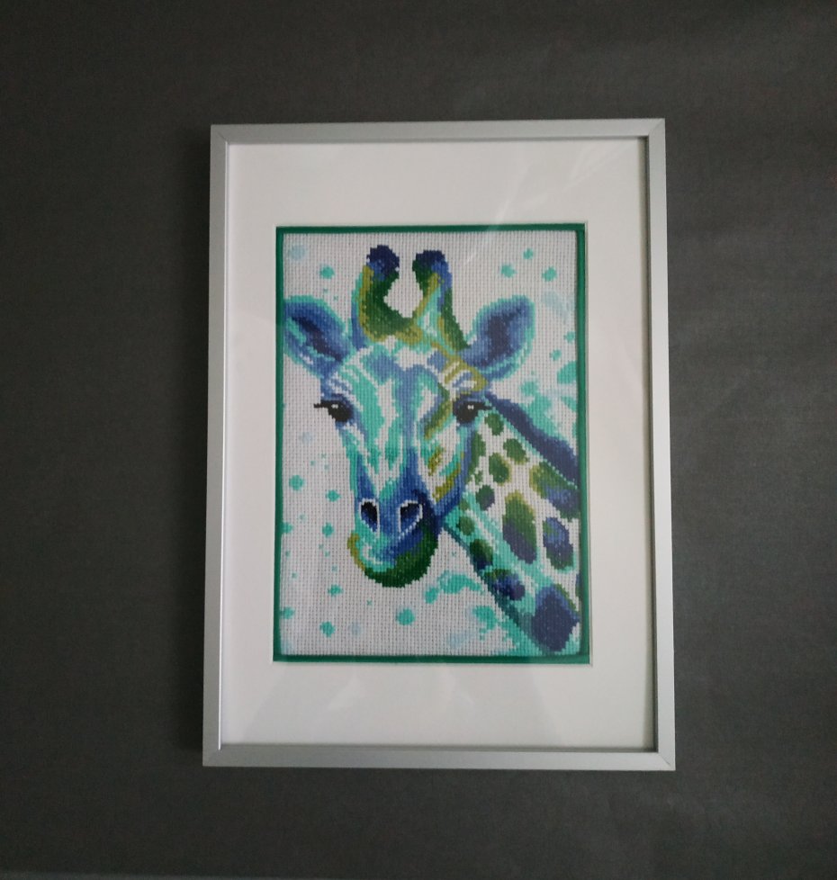 nowy, ręcznie haftowany obrazek żyrafy w kolorach zielono niebieskich.