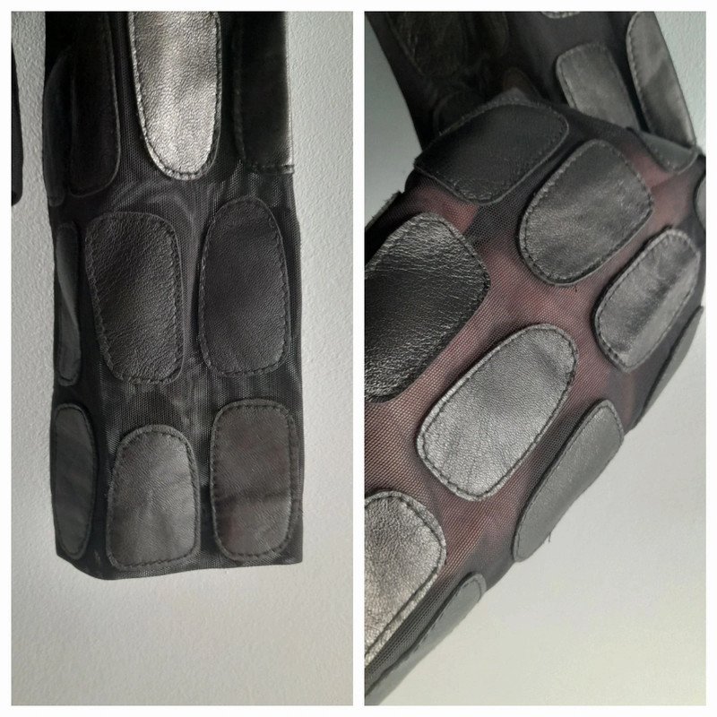 Piękna unikatowa kurtka/bluzka z naszywanymi aplikacjami ze skóry jagnięcej można nosić jako bluzkę na gole ciało 'rękawy są z przezroczystej siateczki całość dwuwarstwowa plus skóra zamek dwustronny jako kurtkę i do różnych stylizacji francuska marka piękny unikatowy okaz stan idealny jak nowa rozmiar firmowy T3 długość bez naciągania 56 pod pachami 48x2 pas45x2 materiał jes lekko elastyczny