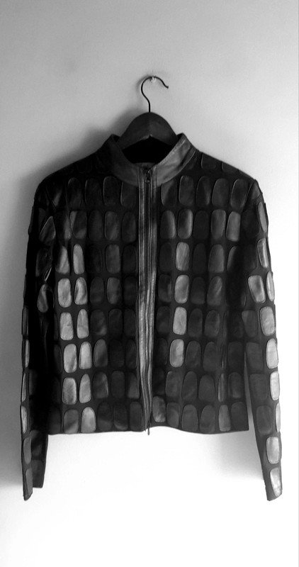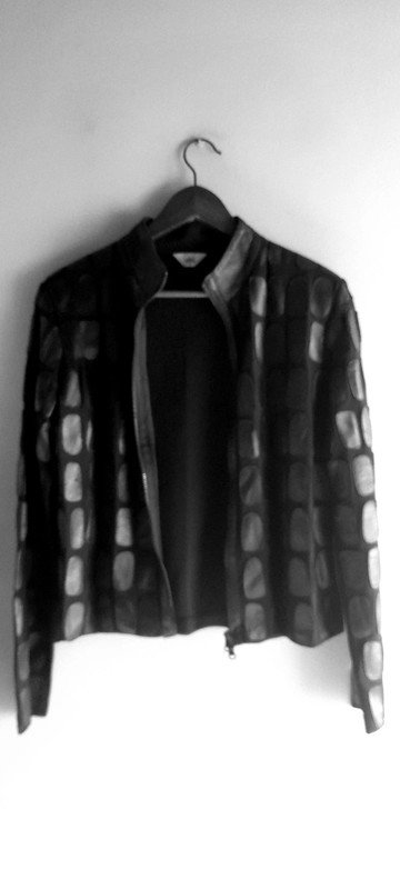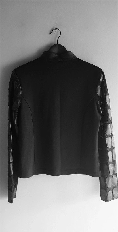 Piękna unikatowa kurtka/bluzka z naszywanymi aplikacjami ze skóry jagnięcej można nosić jako bluzkę na gole ciało 'rękawy są z przezroczystej siateczki całość dwuwarstwowa plus skóra zamek dwustronny jako kurtkę i do różnych stylizacji francuska marka piękny unikatowy okaz stan idealny jak nowa rozmiar firmowy T3 długość bez naciągania 56 pod pachami 48x2 pas45x2 materiał jes lekko elastyczny