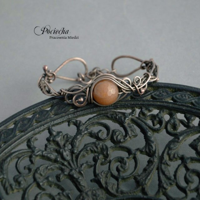 Piękna bransoletka stworzona ręcznie z miedzi jubilerskiej i fasetowanej kuli agatu o piaskowo - rudym kolorze. W miejscu najszerszym bransoletka osiąga ok. 1,8 cm. Bransoletka została spatynowana i wypolerowana co pięknie wydobyło charakter splotów. Obwód ok. 17 cm ( + łańcuszek przedłużka ). Zapinana na haczyk. Projekt autorski, powstała w pojedynczym egzemplarzu. Polecam.