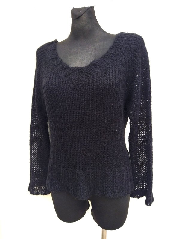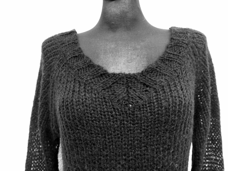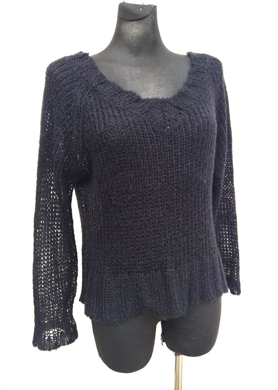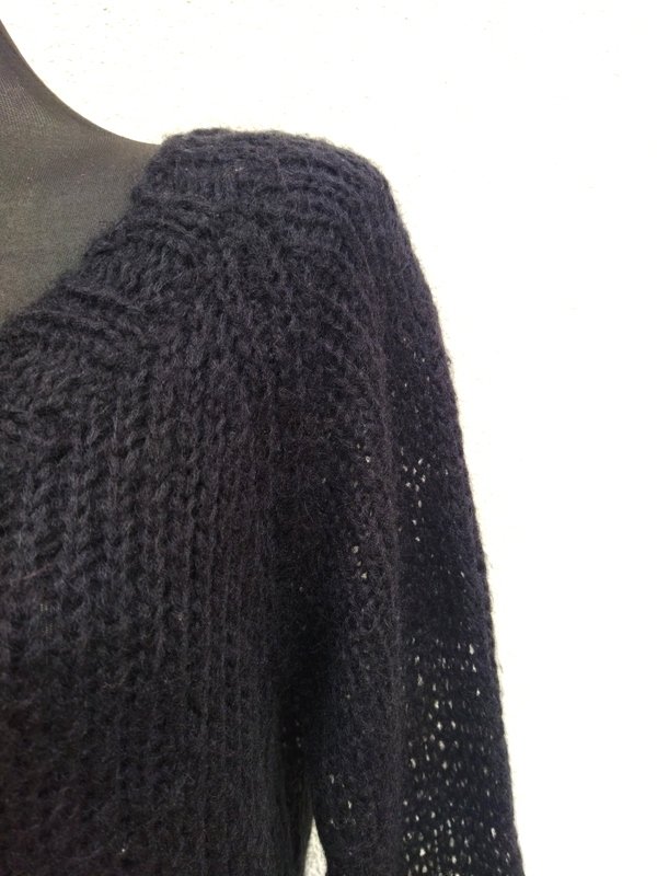 Krótki sweter z akrylowej włóczki i moheru z domieszką nylonu w czarnym kolorze, o luźnym splocie . dekolt w serek, rękawy raglanowe. wykończony ściągaczami. Podatny i mocno rozciągliwy