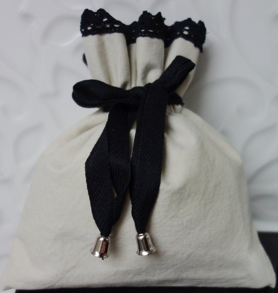 Bardzo estetycznie uszyta, tkanina jest także w środku. Szwy kryte. W boki sakiewki wszyta czarna bawełniana koronka szerokości półtora centymetra.