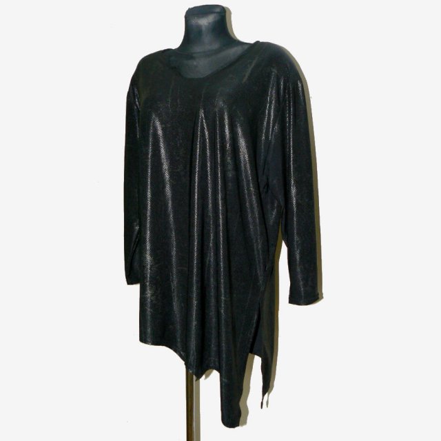 Asymetryczna tunika z czarnej elastycznej tkaniny o fakturze wężowej skóry. Francuska marka Jean Marc Philippe.