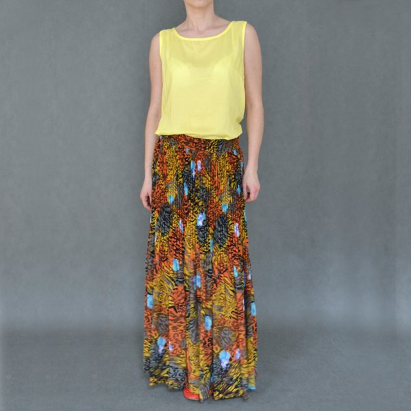 Długa spódnica marki BETTY BARCLAY w pomieszane wzory i kolory. Wzory od kwiatów po tygrysy i panterkowe łaty. Kolory to musztarda, pomarańcz, turkus i khaki. Na gumce. Od góry plisowana i rozprostowana na dole. Bardzo ciekawa. Polecam.
