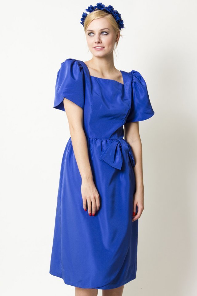 Sukienka z kobaltowej tafty, zapinana z tyłu na zamek, odcinana w pasie, ozdobiona w talii kokardą. Dekolt trapezowy rękaw u góry rozcięty, w formie bufki. Marka Kappi, made in USA, lata najprawdopodobniej 80.