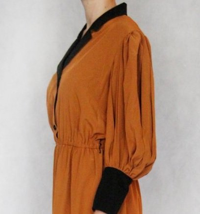 Piękna sukienka z dawnych lat, świetnie skrojona i wykończona. W kolorze karmelu. Sukienka na pewno ma ok. 40lat, może więcej, a krój sugeruje lata 20-30te.