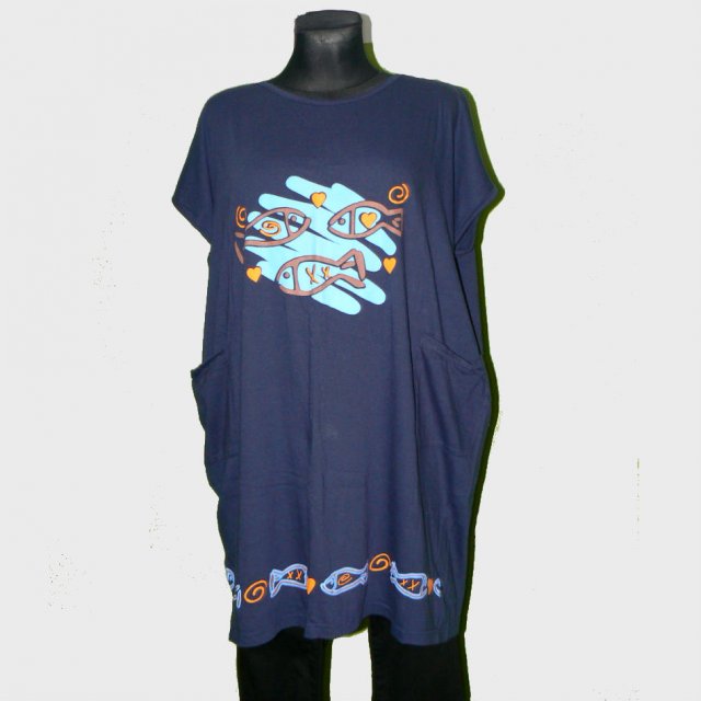 Granatowa tunika ze świetnym azteckim motywem i dwiema dużymi kieszeniami. Tunika prosta, obszerna w formie, tył gładki.