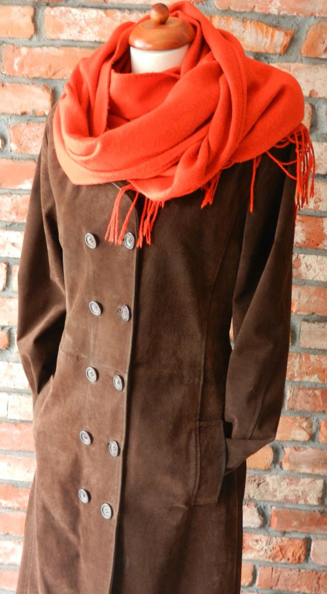 Bardzo długi zamszowy płaszcz. Dość sztywny i ciężki. Na podszewce. Po bokach kieszenie.