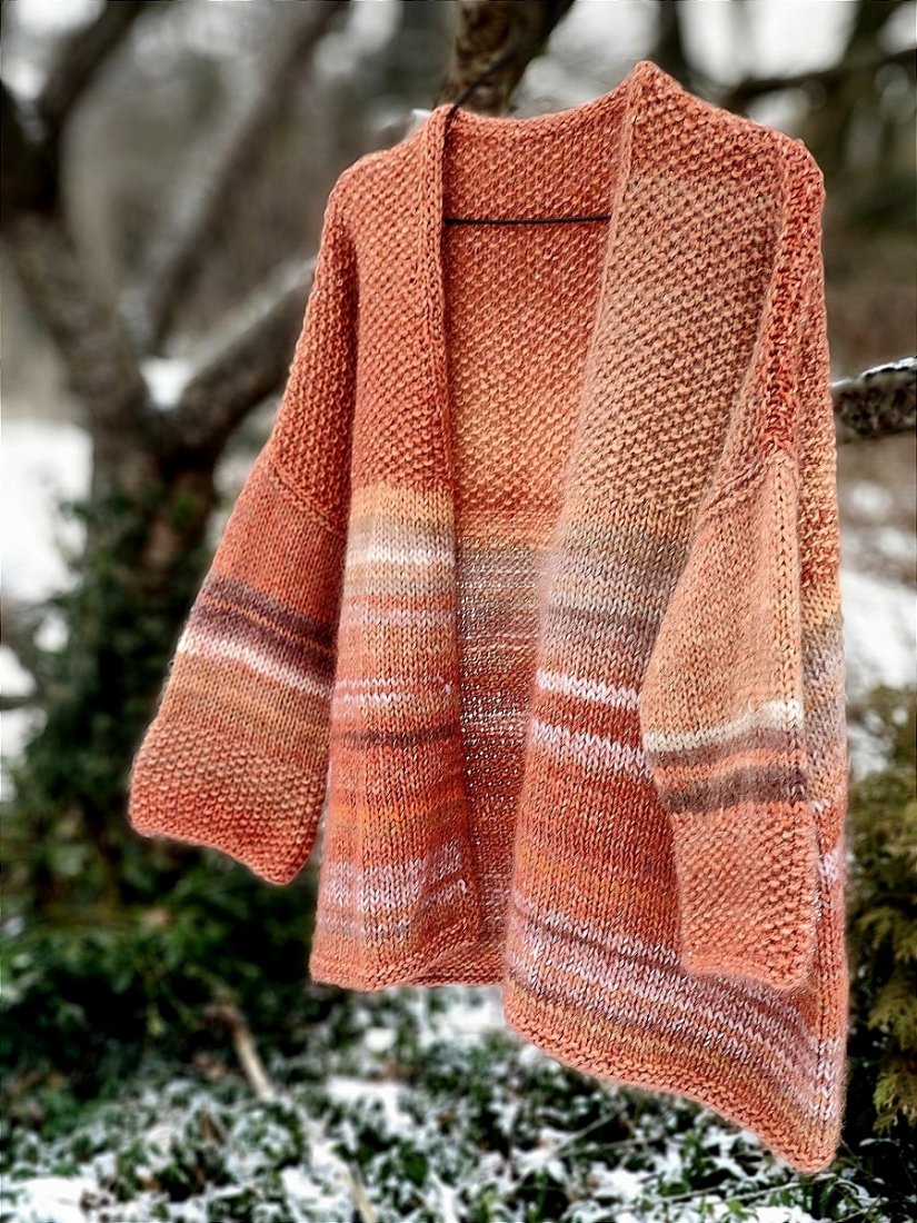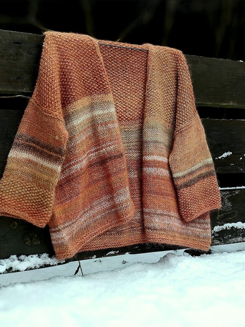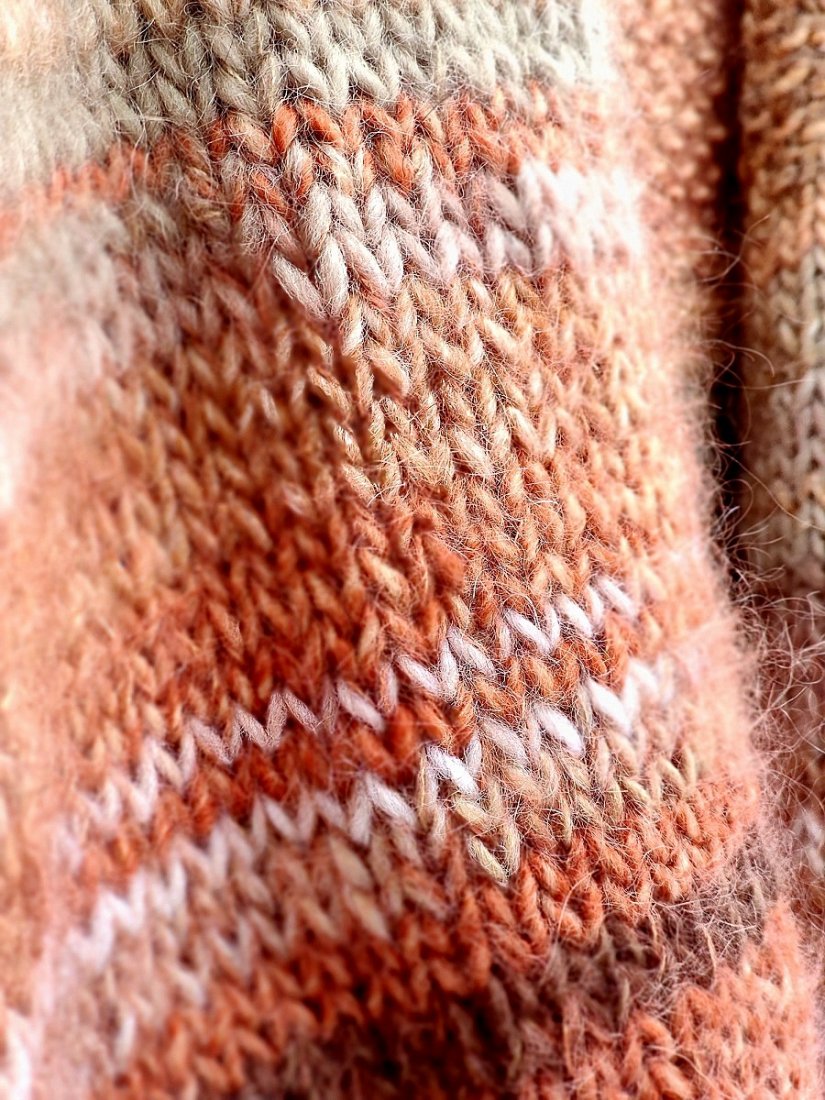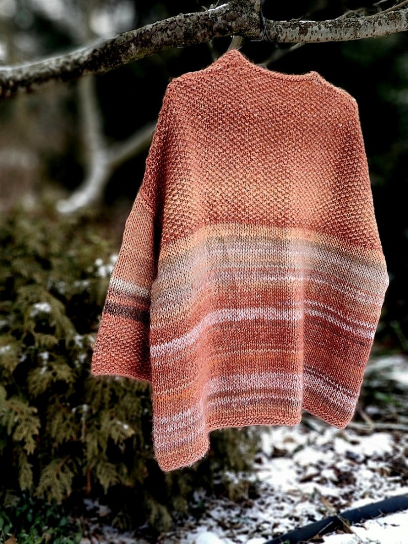 Wykonany ręcznie/ na drutach z włoskich włóczek. Świetny w dotyku: miękki, puchaty i lejący. W kilku miejscach dyskretnie połyskujący miedzią włosek.