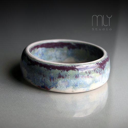 Efektowna, lekko nieregularna, ceramiczna bransoletka ręcznie wykonana najwyższej jakości porcelany barwionej, szkliwiona mieszanką białokremowych, błękitnych,zielonych i fioletowych szkliw z efektem plamek Średnica wewnętrzna około 6,5cm, szerokość około 2,5cm, grubość około 8mm. Polecam