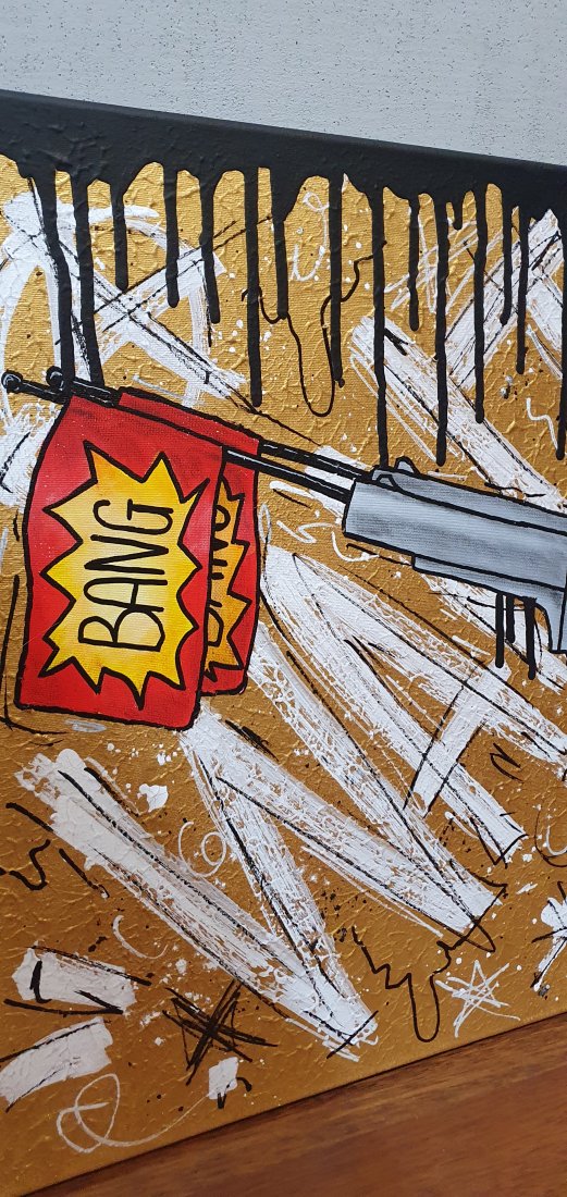 Wykonany w technice akrylowej z użyciem złota strukturalnego i wykończony markerem.