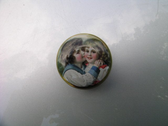 niewielkie Metalowe na błyszcząco wykończone Pudełeczko na drobiazgi...Słodki bardzo obrazek na wieczku. Wewnatrz dla podniesienia pojemności plastikowe wykończenie.