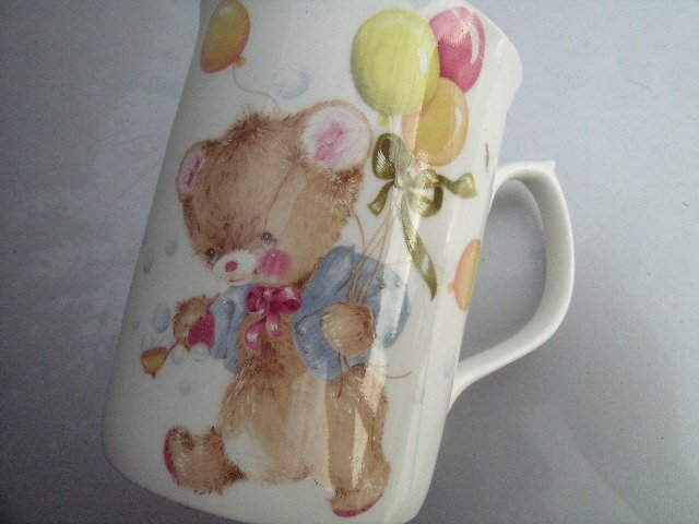 Uroczy Porcelanowy Kubek. Nie sygnowany,ale szlachetny. Mocna porcelana,ale prześwitująca. Biel tła i słodkie misie w pastelowych barwach. Wykończenie ciekawe,bo całość błyszcząca tylko niektóre elementy wzoru np. misie noski są satynowe.