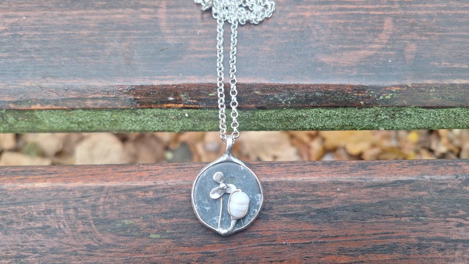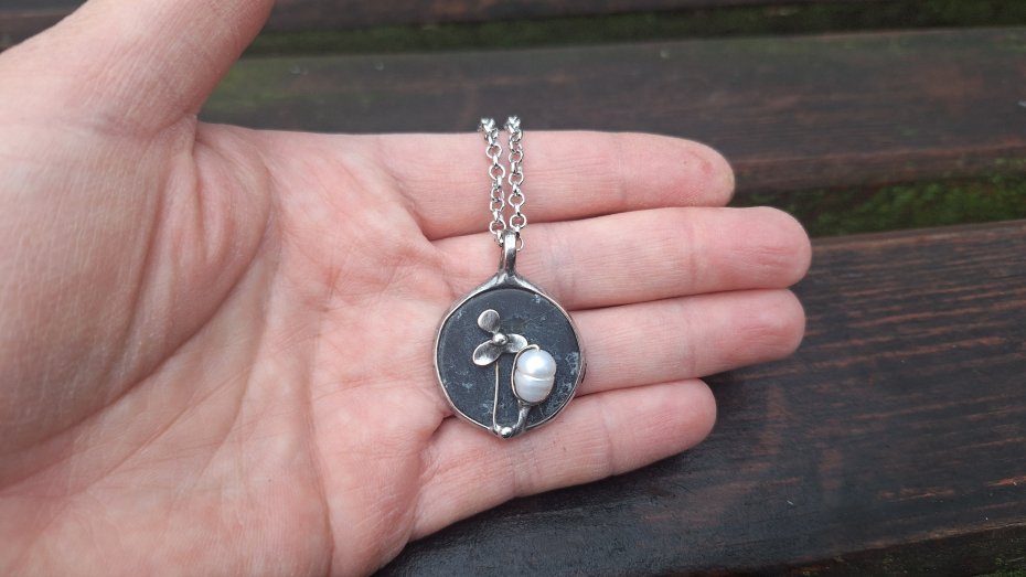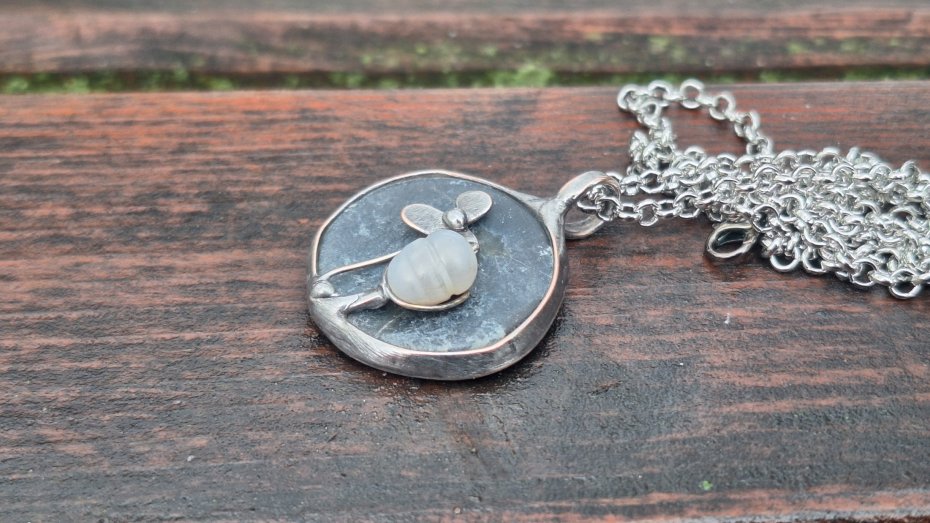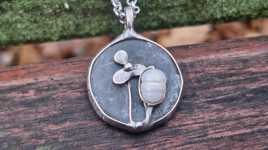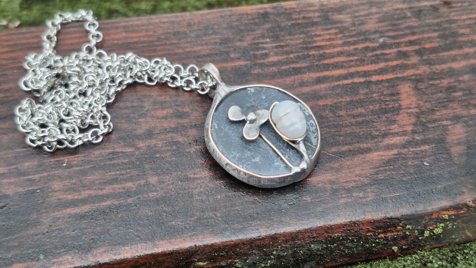 Wisiorek wykonany z miedzi, cyny, perły i agatu. Wymiary ok. 2.5 na 2.5 cm. Zawieszony na łańcuszku o długości ok. 50 cm.