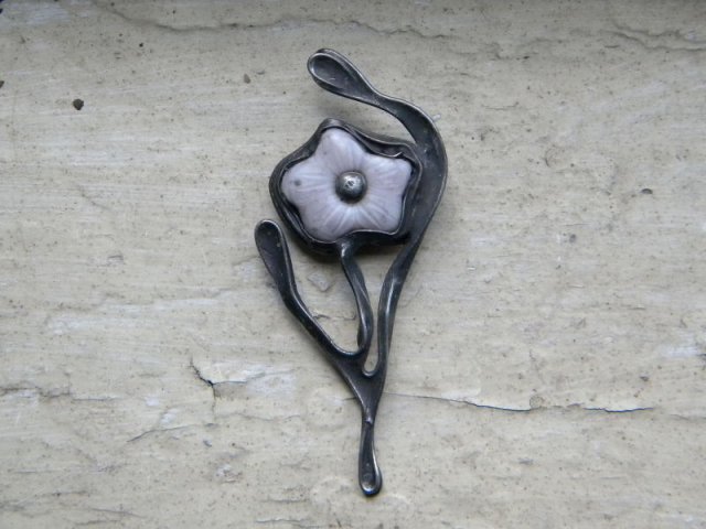 broszka wykonana w technice tiffany ze szkła,miedzi i cyny.Szkło wyrób własny w kolorze jasnego mlecznego wrzosu. wymiary 7,2cm x 3,4cm.