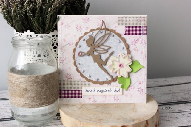 Dziewczęca karteczka z wróżką. Wykonana na kremowej bazie w formacie 15x15 cm. Ozdobiona brokatem, przeszyciami oraz tasiemkami. Będzie pięknym dodatkiem do prezentu urodzinowego, imieninowego lub sama w sobie będzie miłym upominkiem.