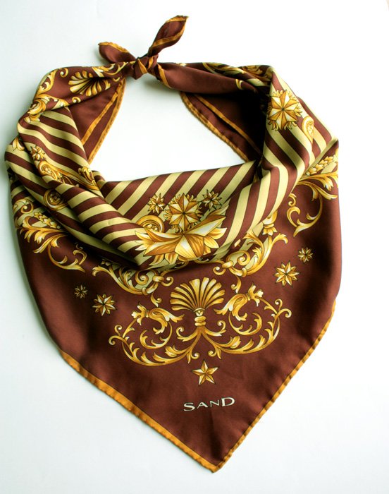 Chusta w kolorze mlecznej czekolady, w królewskie wzory a la Hermes w odcieniu pistacjowej zieleni. Materiał oceniam na jedwab (brak metki). Chusta luksusowej marki Sand.