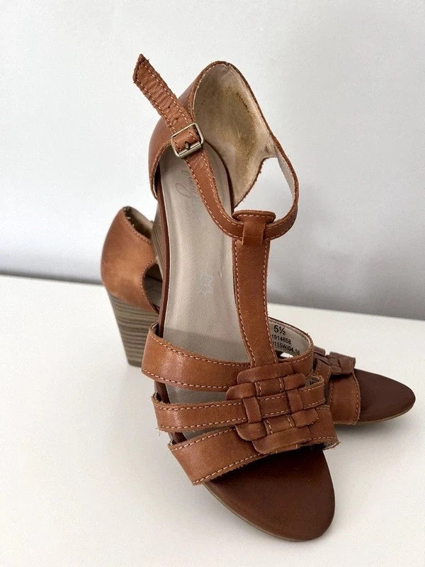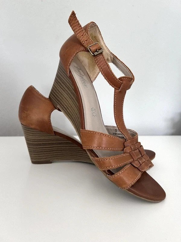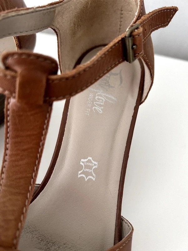 Sandały na koturnie ok. 7 cm. Footgloves rozmiar 5 i pół czyli 39, raczej na szerszą stopę. Długość wkładki 25 cm. Na zewnątrz i w środku wykonane ze skóry naturalnej. Klasyczny model, kolor karmelowy, jasny brąz, miękka wyściółka, paseczki z mięciutkiej skóry, wygodne, pray zapięciu gumka. Szafa kapsułowa, old money style. Polecam