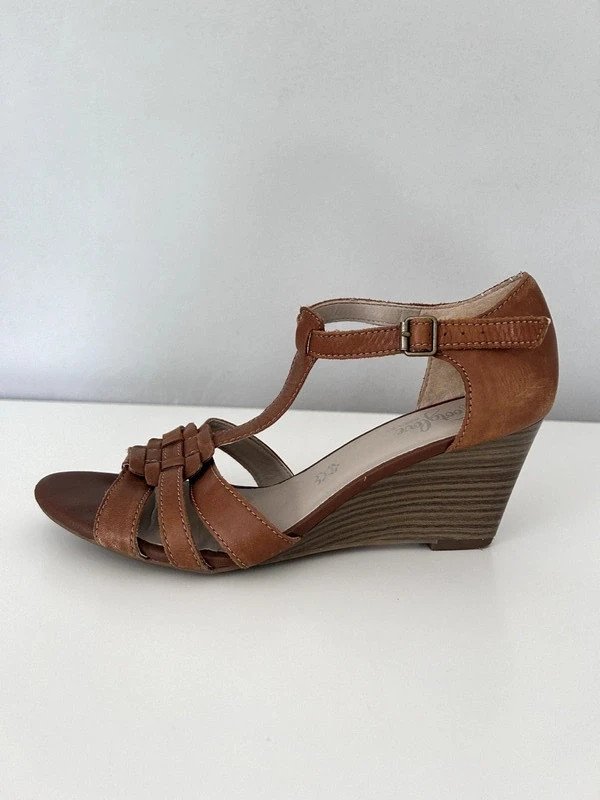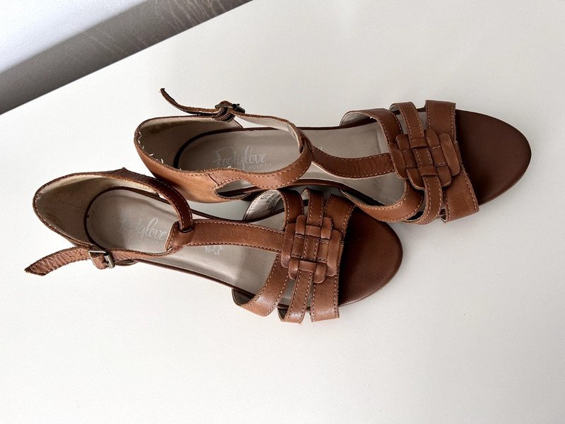 Sandały na koturnie ok. 7 cm. Footgloves rozmiar 5 i pół czyli 39, raczej na szerszą stopę. Długość wkładki 25 cm. Na zewnątrz i w środku wykonane ze skóry naturalnej. Klasyczny model, kolor karmelowy, jasny brąz, miękka wyściółka, paseczki z mięciutkiej skóry, wygodne, pray zapięciu gumka. Szafa kapsułowa, old money style. Polecam