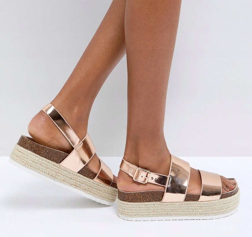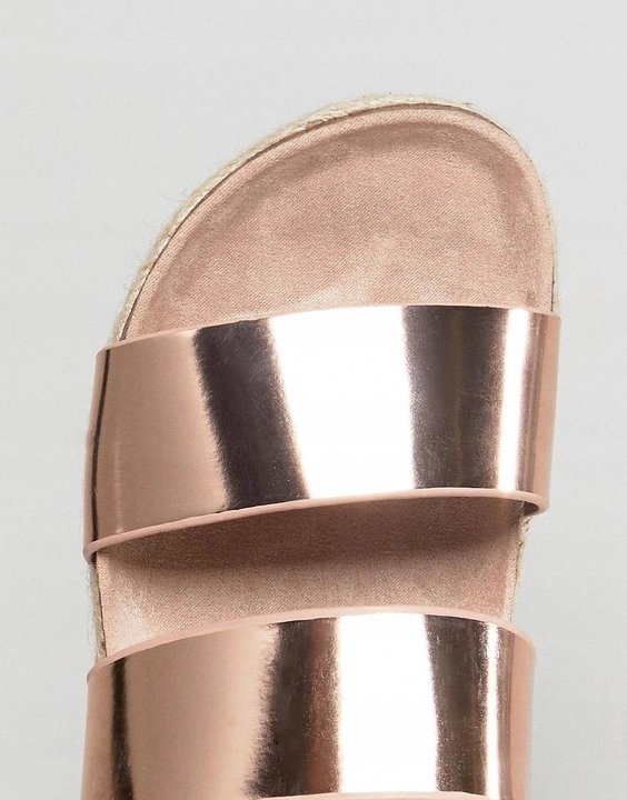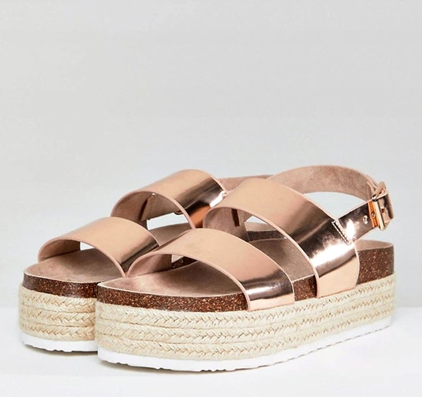 Metaliczne sandały na platformie (plecionka + mieszanka gumy i korka). Zapięcie regulowane klamrą. Wkładka wewnętrzna wyprofilowana, pokryta tkaniną zamszową. Styl, wygoda i kilka cm extra. Ładnie dopełniają klasyczne zestawienia, idealne do sukienek, szortów, szwedów.