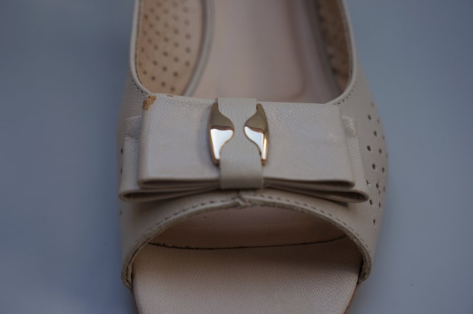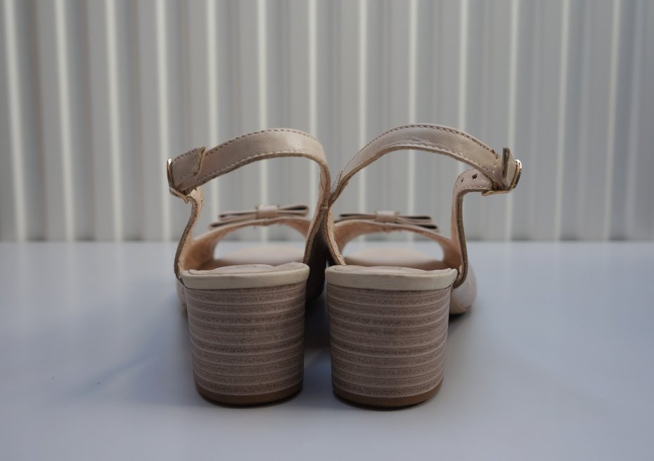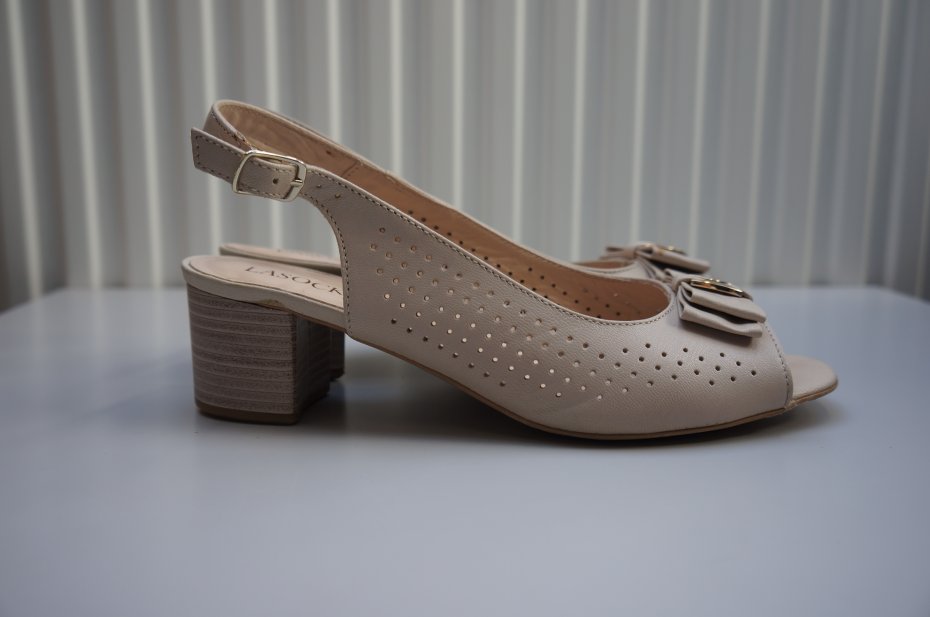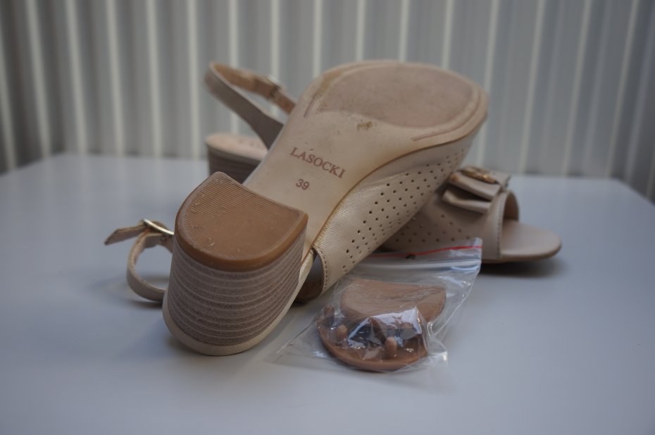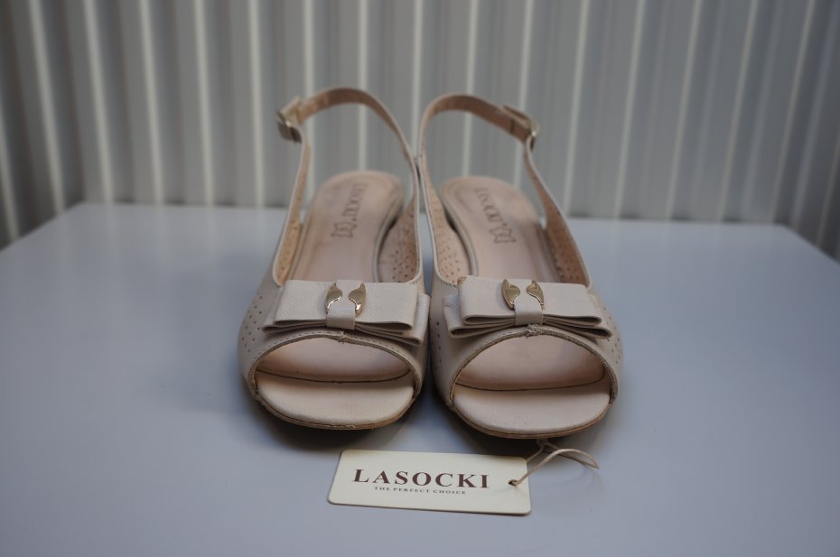 Skórzane sandały marki Lasocki. Ażurowa cholewka. Z przodu kokardka z metalicznym elementem/mała skaza pokazana na ostatnim zdjęciu/. Odkryte palce oraz zapięcie na pasek wokół pięty z klamerką. Stabilny obcas. Kolor beżowy. Oryginalne opakowanie oraz komplet fleków wymiennych do obcasów. Dwa razy założone.