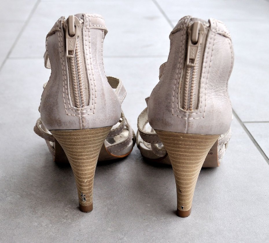 Stan: noszone. Wady: Ślady noszenia na podeszwie (zachowane plastikowe naklejki informujące o użytych do produkcji materiałach); obcasy zarysowane w kilku miejscach; fleki odrobinę starte; natomiast wszystkie paski całe, bez naderwań czy pęknięć, zamki chodzą bez zarzutu.