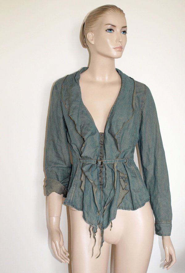 oryginalny, letni żakiet/koszula marki sandwich. materiał 55% len 45% bawełna. materiał w kolorze niebieskim z domieszką beżu, co daje odcień "brudny niebieski" . bardzo ciekawe detale, zapięcie na plastikowe zatrzaski, mankiety także. stan bardzo dobry. rozmiar z metki 38. Podaję wymiary mierzone na płasko;