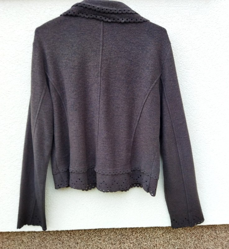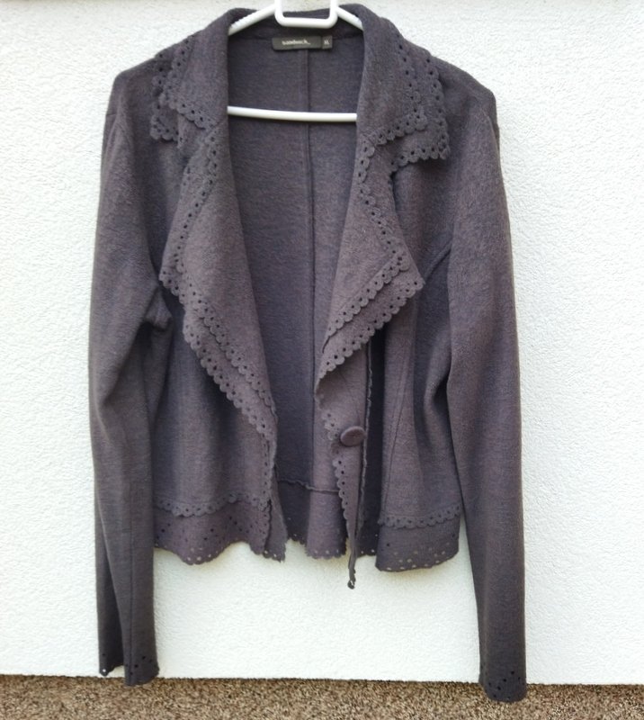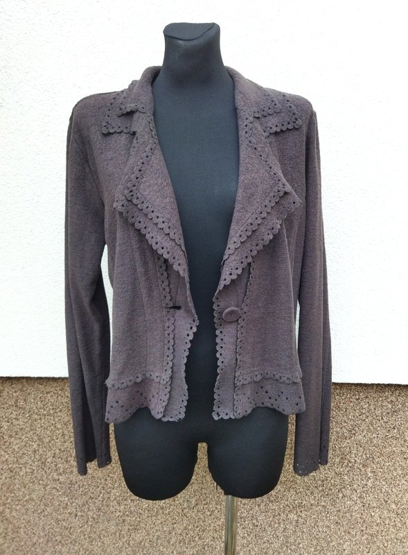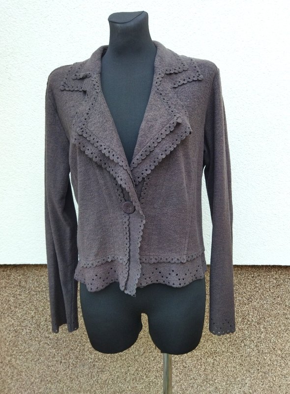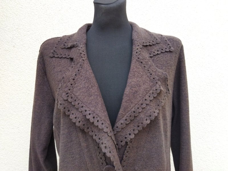 Dzianinowa marynarka w kolorze gorzkiej czekolady z dużym udziałem wełny zdobiona laserowymi wycięciami . Z kołnierzem z rewersami, zapinana na jeden obciągany tkaniną guzik. Bez podszewki.