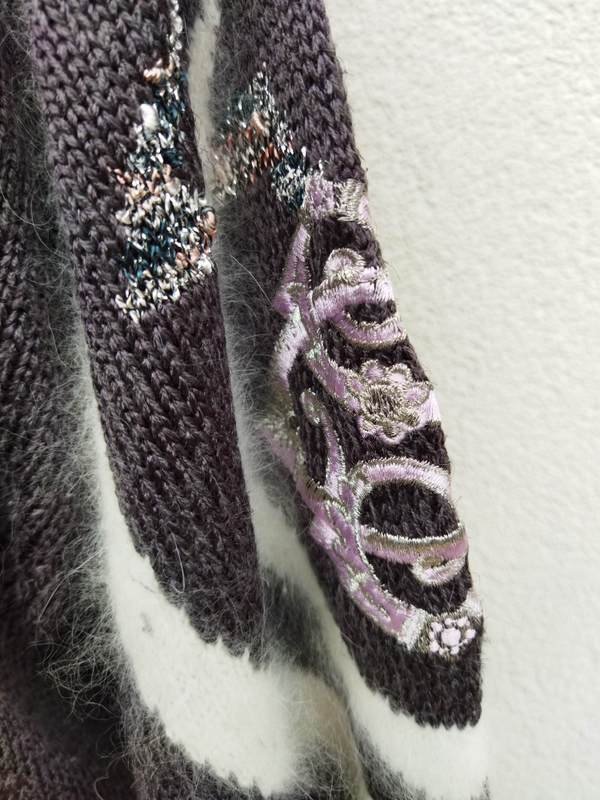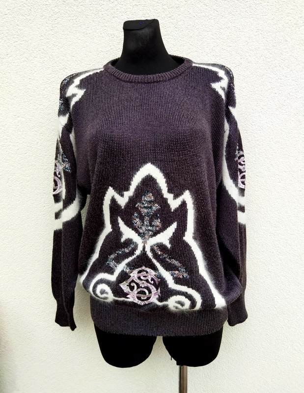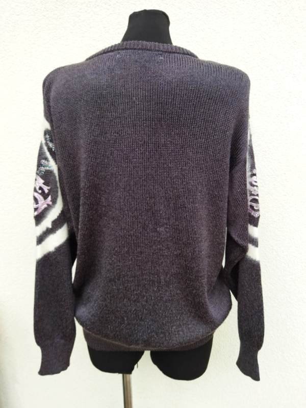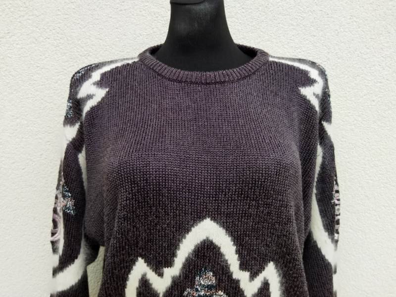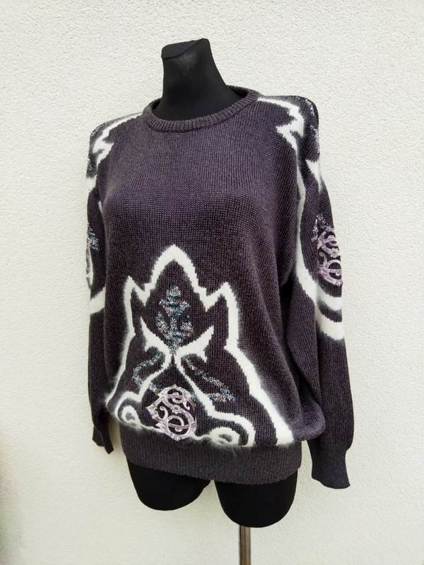 Sweter vintage z mieszanki składników w bazowym ciemnoszarym kolorze z wzorami z białej angory, włóczki boucle z metalizowanymi włóknami i haftowanych aplikacji w liliowo-srebrnym kolorze. Wykończony ściągaczami