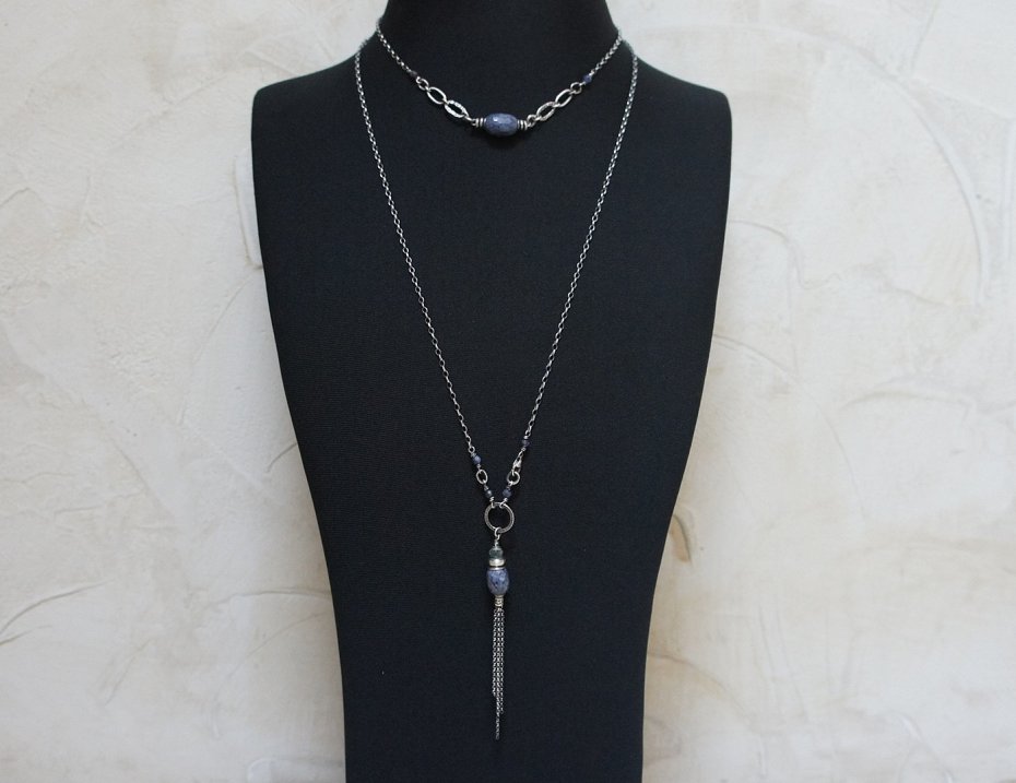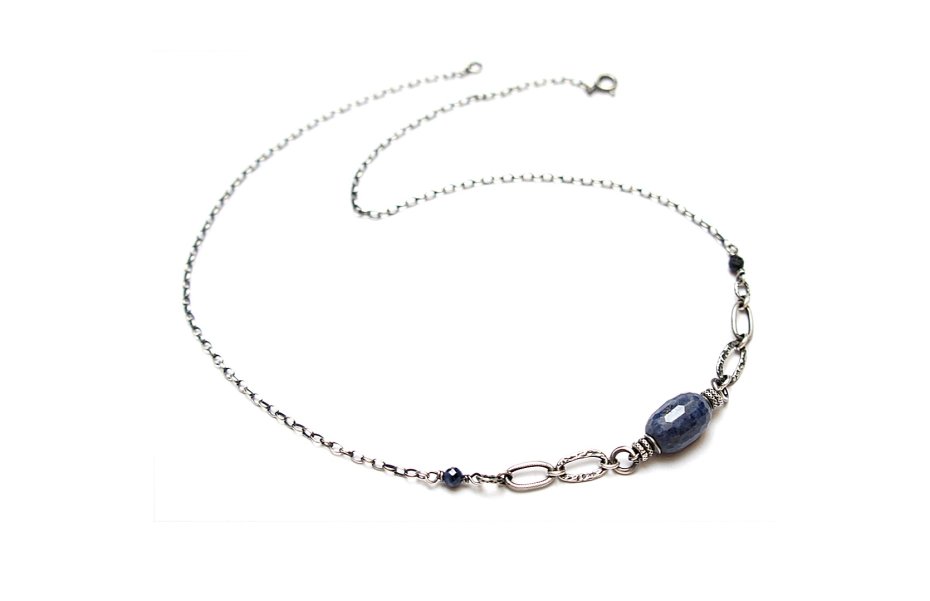 Naszyjnik wykonany ze srebra [pr. 925] w połączeniu z fasetowana oliwka szafiru [14mm- kamień posiada naturalne niedoskonałości -wżery]oraz fasetowanymi kuleczkami szafirów [4mm] .Całość oksydowana i przetarta. Całkowita długość naszyjnika 49 cm. Biżuteria ozdobnie zapakowana. Naszyjnik skomponowany tak, by mógł stanowić komplet z drugim naszyjnikiem widocznym na zdjęciach.