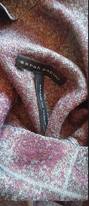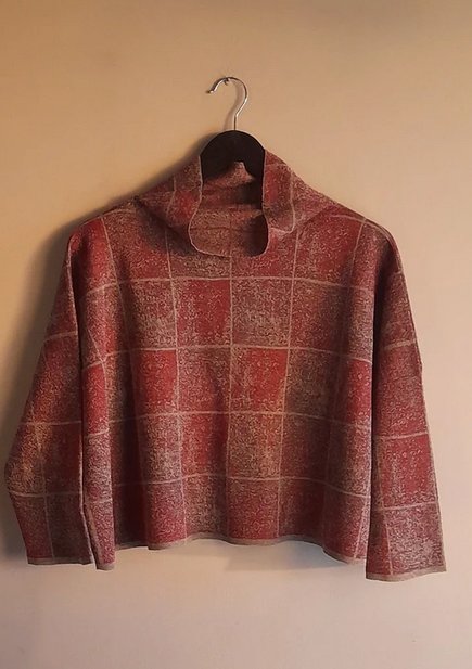 Nowy bez papierowej metki krótki pudełkowy sweter oversize cienki lekko szorstki z dyskretną błyszczącą nitką całość bardzo stylowa długość 44 szerokość 72 rękaw 3/4 świetny nietypowy zestaw kolorystyczny cegła szary