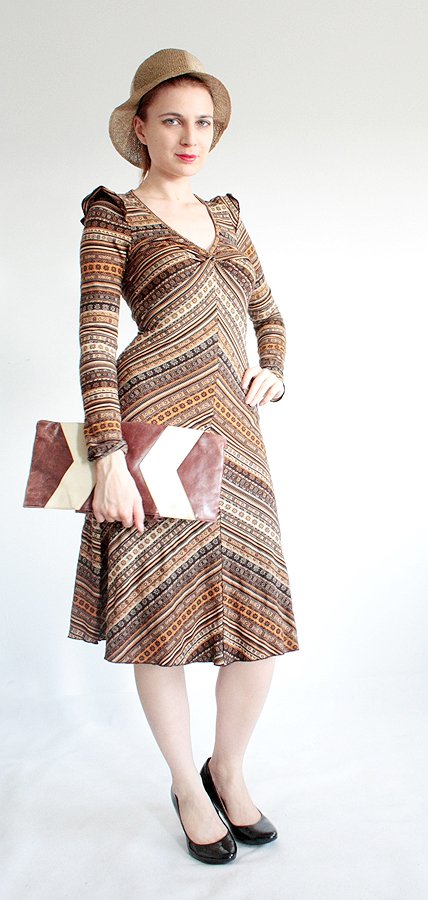 Włoska sukienka z dzianiny w kolorach jesieni. Materiał rozciąga się i dopasowuje do sylwetki.