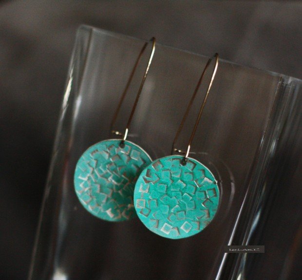 Intrygujące kolczyki wykonane ręcznie z aluminium ( tarcze - śr.ok.-2,4 cm ) .Tarcze w formie delikatnych talerzy satynowane , rysowane , repusowane , z ciekawą fakturą mozaiki , środek malowany profesjonalnym , specjalistycznym woskiem w tonacji aquamarine . Zabezpieczony odpowiednim medium przed wpływem czynników zewnętrznych . Zawieszone na efektownych , długich , zapinanych biglach z metalu antyalergicznego wysokiej jakości (wolne od ołowiu i niklu) w kolorze ciemnego srebra . Biżuterie wysyłam w ozdobnym bezpiecznym opakowaniu .