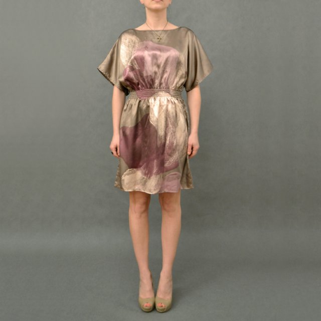 Kobieca sukienka wykonana z materiału satynopodobnego. W talii gumka. Ciekawe wzornictwo.