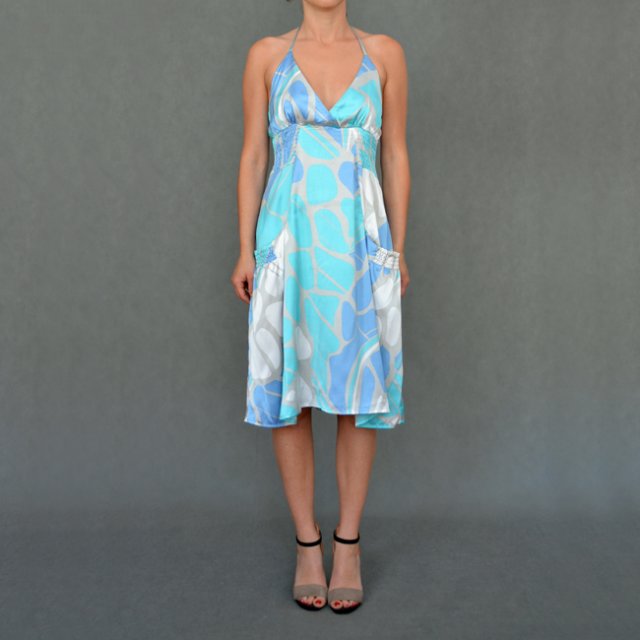 Śliczna sukienka w kolorze błękitu, lazurowego i szarości. Bardzo przewiewna, idealna na upały - czuje się jakby chłodziła. Wiązana na szyi, z tyłu gumka, bo bokach kieszonki. Polecam.